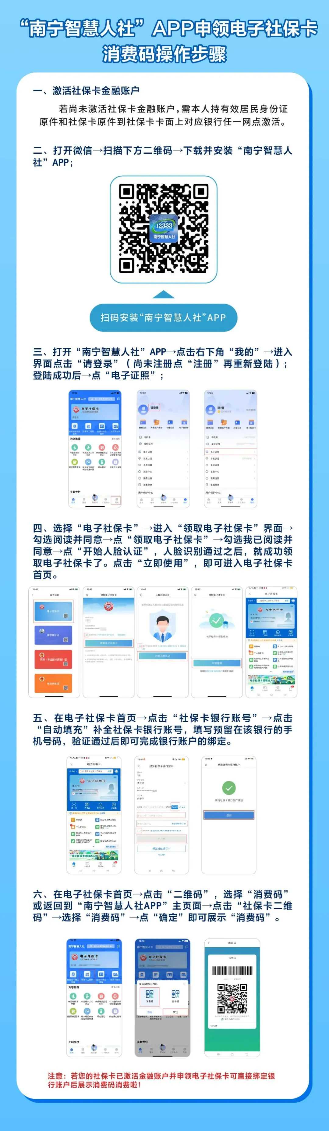 (一)如未激活社保卡金融账户,需本人持实体社保卡及身份证原件至社保卡卡面上对应的银行任一网点办理激活,并预存足额资金;如通过手机支付参与活动,则需在南宁智慧人社APP或云闪付APP绑定社保卡金融账户。