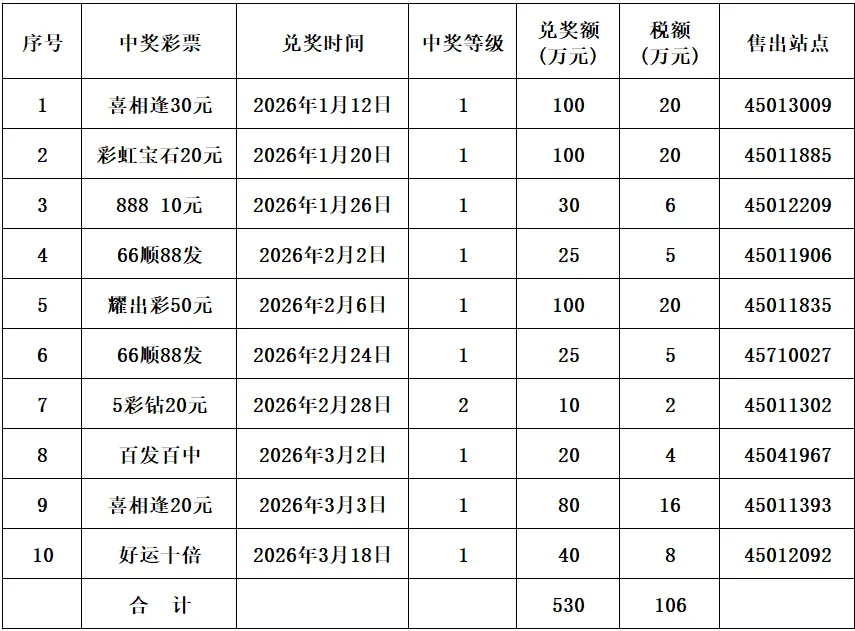 2026年一季度,南宁市共中出1万元及以上“刮刮乐”彩票大奖10个,其中一等奖9个,二等奖1个,奖金合计530万元,共缴纳偶然所得税106万元。