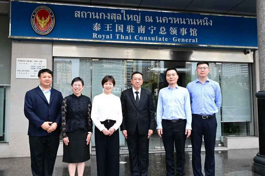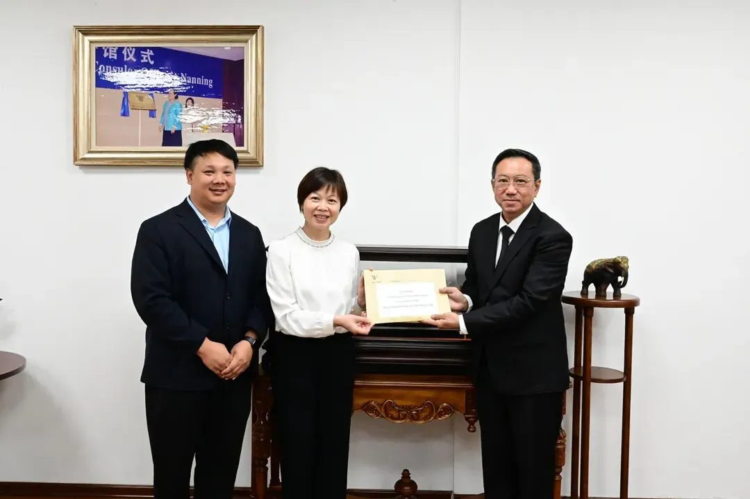 2026 年 4 月 9 日,泰王国驻南宁总领事萨森·萨罗博先生会见了来访的广西师范大学国际合作与交流处处长、国际文化教育学院院长李冬梅教授一行。随行人员包括国际文化教育学院党委副书记孙中会、国际合作与交流处副处长凡文吉副教授,以及国际学生管理科职员魏冰彦。代表团专程从桂林赶赴南宁,递交了广西师范大学校长孙杰远教授致萨森总领事履新的贺信。会谈期间,李冬梅教授介绍了广西师范大学的情况,双方就进一步扩大泰国与广西在教育领域的合作进行了深入交流,特别是鼓励泰国学生学习科学技术专业硕士学位。