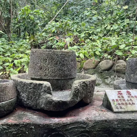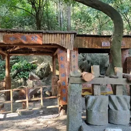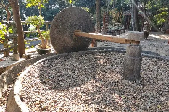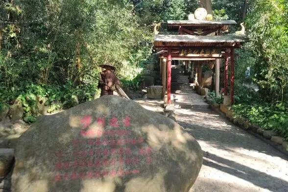 岩洞外古朴典雅,独具特色的壮文化大观园内,绿树成荫,曲径通幽,竹竿哒哒,山歌袅袅,酒气氤氲、猴子嬉戏,一幅幅生动的画面,处处映入眼帘,美不胜收;粗陋斑驳的农具、石器,图案精美的土布壮衣,默默地展示着壮族人那曾经的辛劳以及智慧的创造。