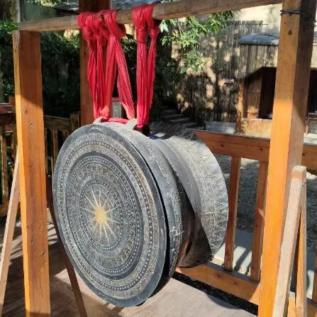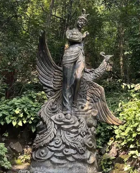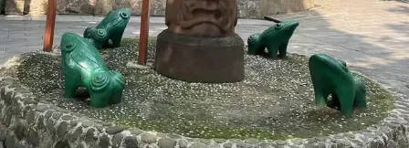 1.核心基底——底部的青蛙(蚂拐)雕塑:是壮族最具代表性的原生图腾,也是壮族稻作文明的精神符号。青蛙在壮语中称 “蚂拐”,被壮族先民尊为雷公之子、蛙神,是沟通天地、掌管雨水的核心神祇,也是壮族稻作民族的 “丰收守护神”。先民因此认为青蛙能呼风唤雨、传递人间祈愿。每年壮族隆重的 “蚂拐节(青蛙节)”,便是通过祭蛙仪式祈求风调雨顺、五谷丰登、人畜兴旺。雕塑的青蛙造型,复刻了广西左江花山岩画、壮族铜鼓上的经典蹲蛙纹样 —— 立体蛙饰。