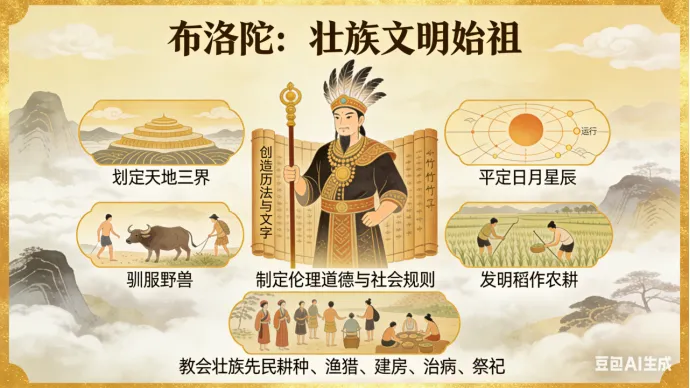 起源与核心功绩:布洛陀是姆六甲的继承者,是天地秩序、人间文明的创立者。他的核心功绩包括:划定天地三界、平定日月星辰、驯服野兽、发明稻作农耕、创造历法与文字、制定伦理道德与社会规则、创立民间信仰体系,教会壮族先民耕种、渔猎、建房、治病、祭祀,完成了从 “创世” 到 “立人” 的文明奠基,是壮族从原始蒙昧走向农耕文明的标志性始祖。
