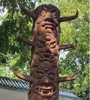 多层堆叠的傩面 / 神像造型柱体垂直分布的多组人面雕刻,是壮族师公傩文化、祖先神与自然神体系的集合,每一张面孔都对应壮族信仰中的神祇,涵盖雷神、山神、水神、土地神、历代祖先神等,是壮族 “万物有灵” 多神信仰的浓缩。