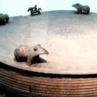 铜鼓是壮族最有代表性的文化遗产,铜鼓沿面的蛙塑像是铜鼓身上最有特色的立体装饰物。蛙在钦州特有的坭兴陶上也灵动地展现出来。蛙图腾信仰深深融入壮族日常生活,如房屋雕刻、服饰图案、儿童玩具等,处处可见蛙的形象。
