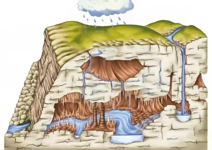 成因是岩溶水的脱气作用:富含碳酸氢钙的地下水进入洞穴后,因环境压力降低、温度升高、水分蒸发,水中 CO₂逸出,碳酸钙(CaCO₃)过饱和析出,持续沉积形成各类次生化学沉积物(钟乳石类)。核心化学反应为:CaCO3+CO2+H2O⇌Ca(HCO3)2(反应正向为溶蚀,逆向为沉积)。按水动力条件,可分为 6 类。