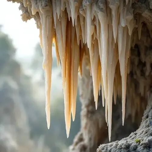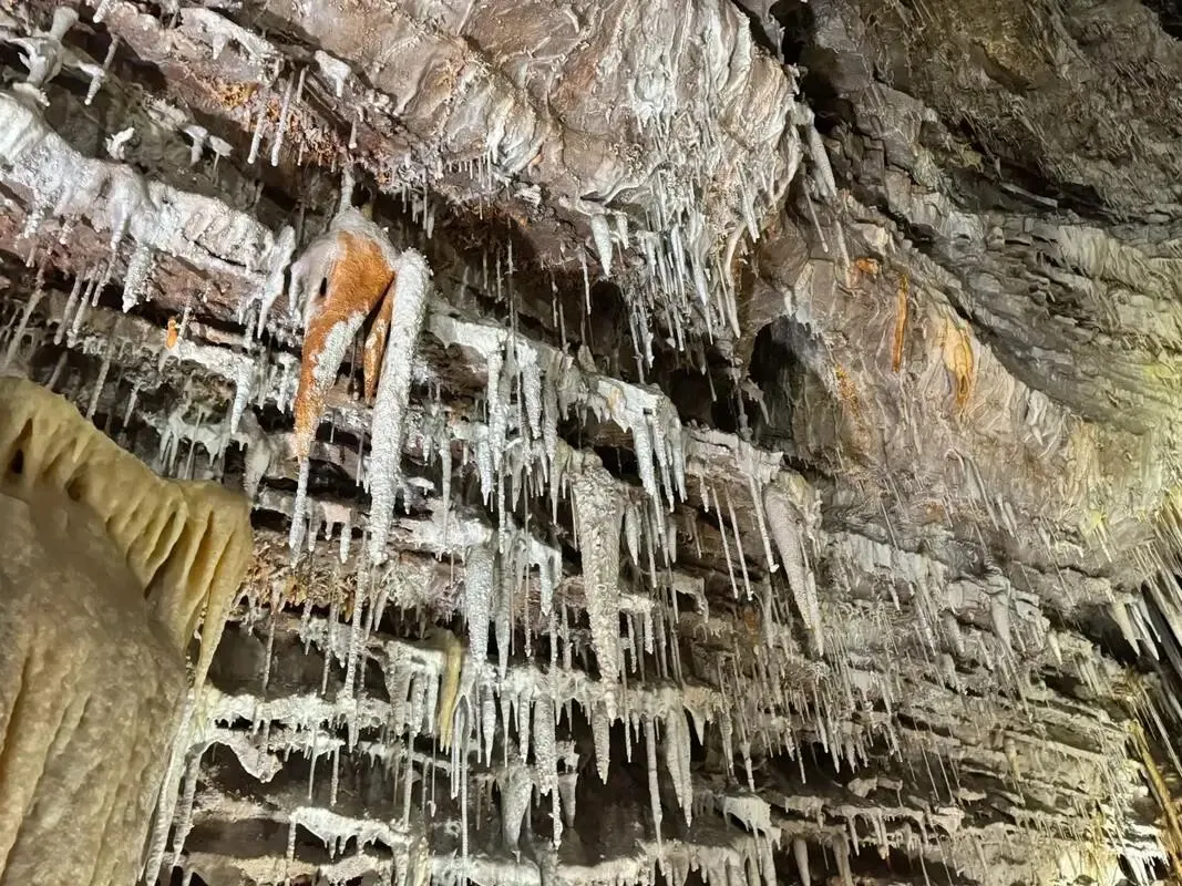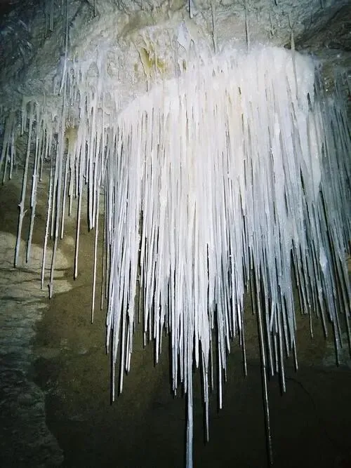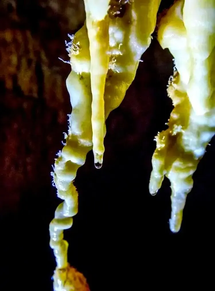 一是鹅管:洞顶垂直向下生长的细长中空管状沉积物,管径均匀、形似吸管。洞顶渗出的细小水滴因表面张力滞留,CO₂快速逸出,碳酸钙在水滴与岩壁接触的环形边缘沉积,形成中空细管;水流持续从管内渗出、沉积,使鹅管不断向下生长。