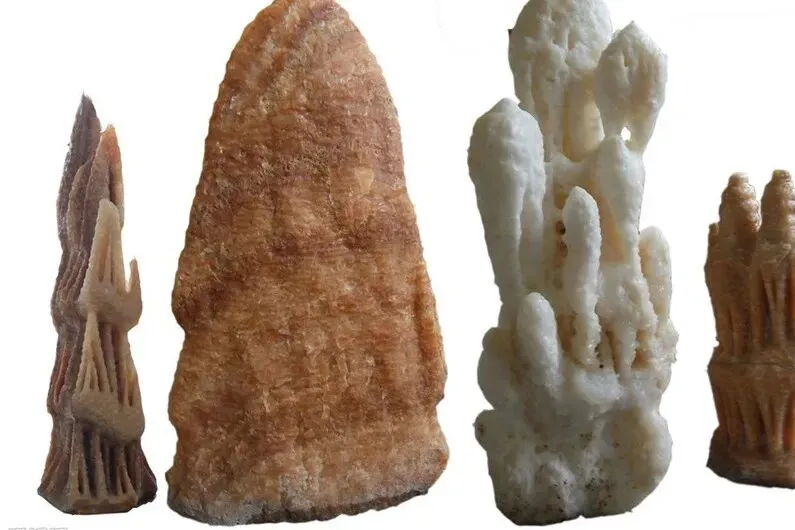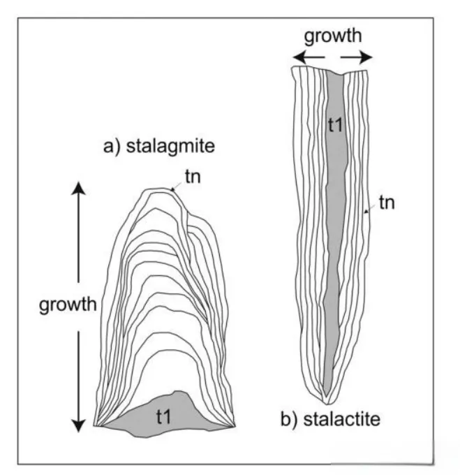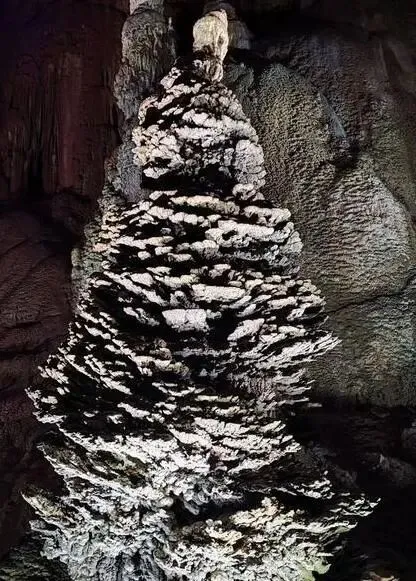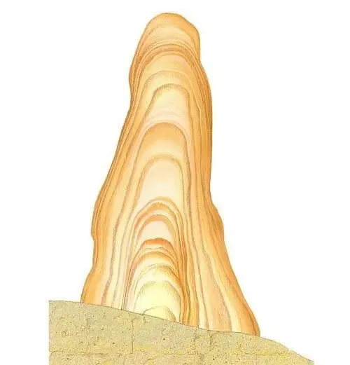 三是石笋:洞底自下而上生长的锥状、塔状沉积物,无中空通道,具同心圆结构。洞顶水滴跌落至洞底,冲击力使水滴破碎成水膜,CO₂快速散逸,碳酸钙在水滴落点处持续沉积,由下向上逐层生长。