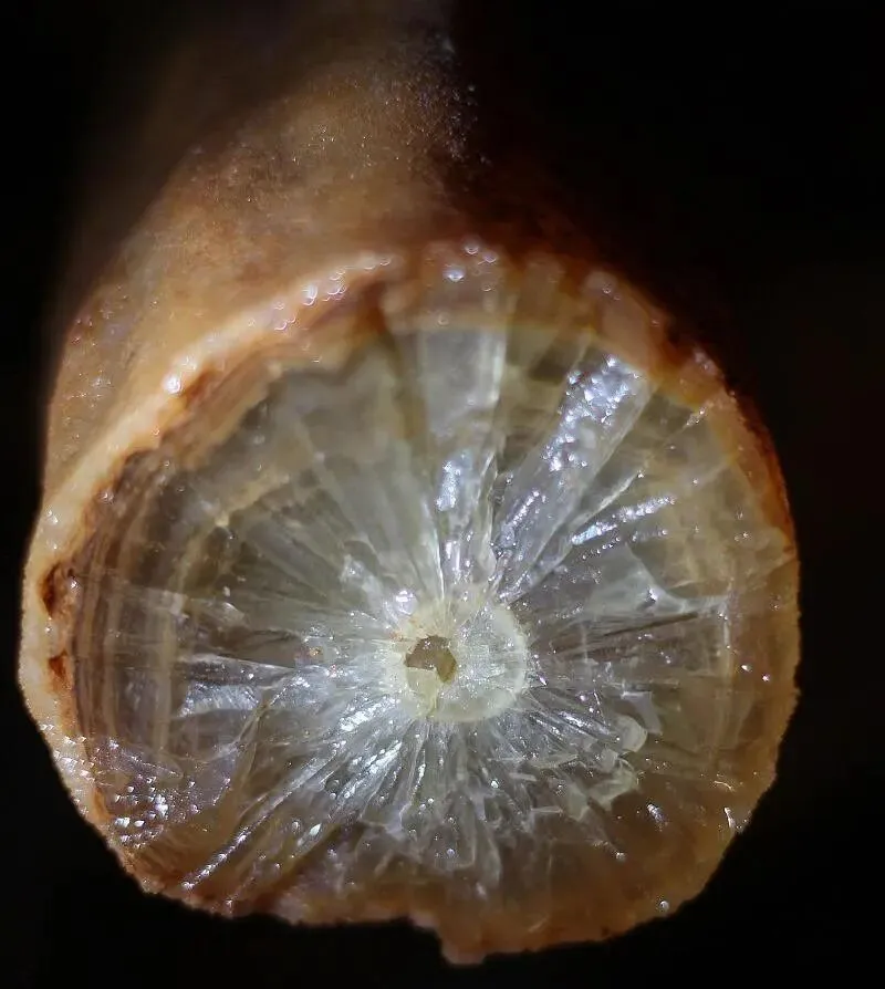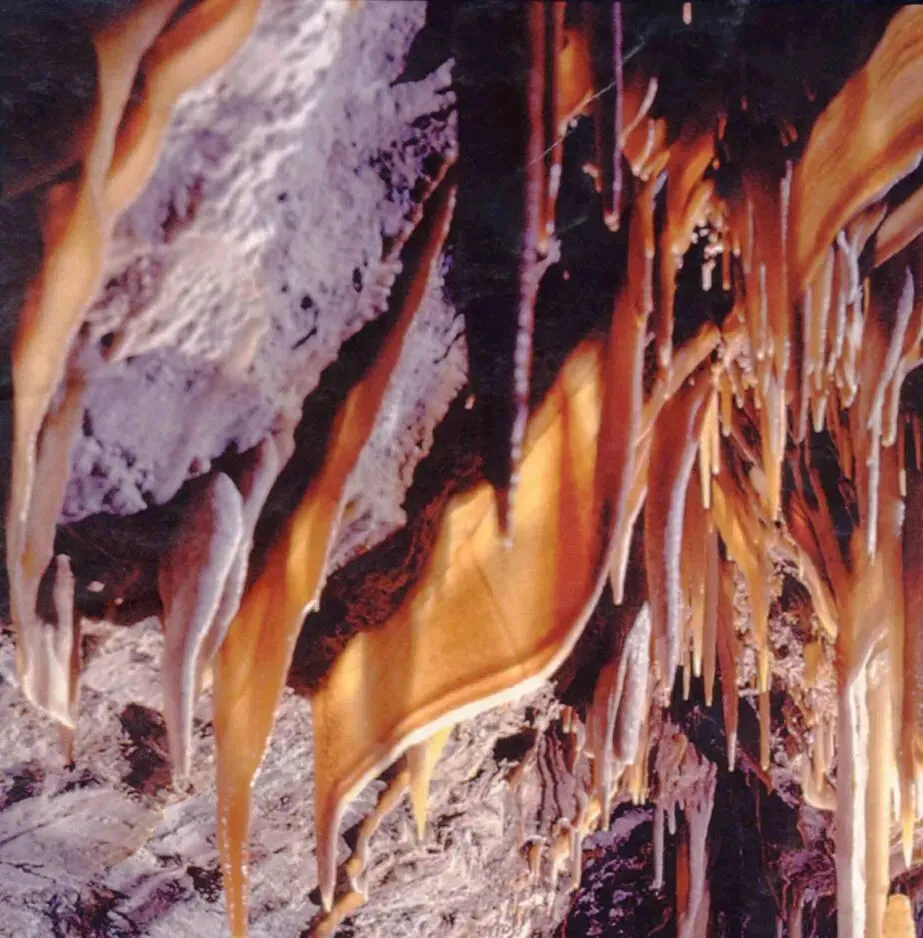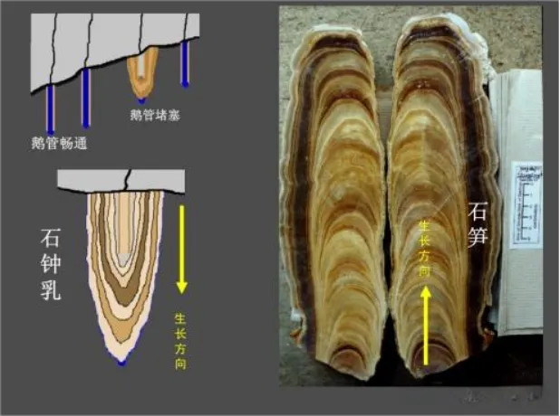 二是石钟乳:悬挂于洞顶的冰锥状、倒锥状沉积物,具中空同心圆结构。鹅管外壁被渗流水覆盖后,碳酸钙沿鹅管外壁逐层沉积,直径不断扩大、向下延伸,最终形成石钟乳。