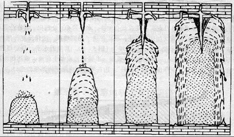 当滴水的碳酸钙含量不饱和时,则会产生溶蚀及滴水窝。堆积形态有时会由于地壳运动或洞底、洞顶的破坏,供水位置或水质水量的改变导致弯曲变形。