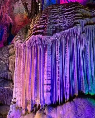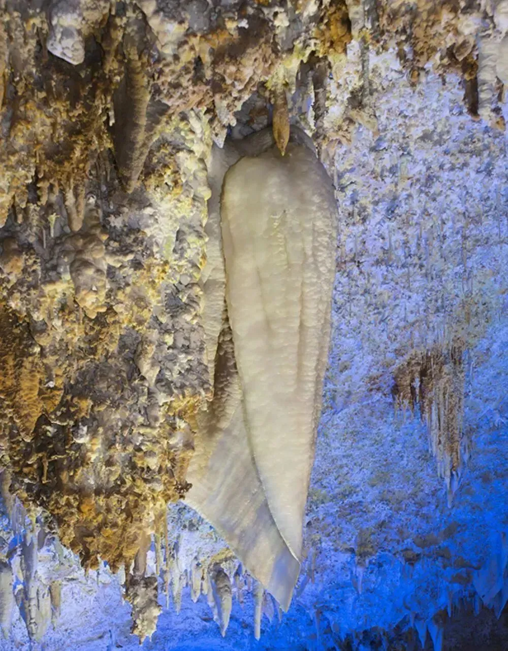 一是石幔(石帘 / 石瀑布):洞壁上的褶状、薄片状、幕布状沉积物,大面积分布时形似瀑布。沿洞壁裂隙渗出的片状水流,在流动过程中持续脱气,碳酸钙沿水流路径逐层沉积,形成连续的层状、褶状结构;长距离流动沉积可形成数十米高的石瀑布。