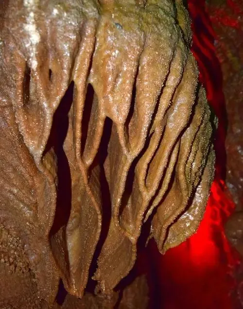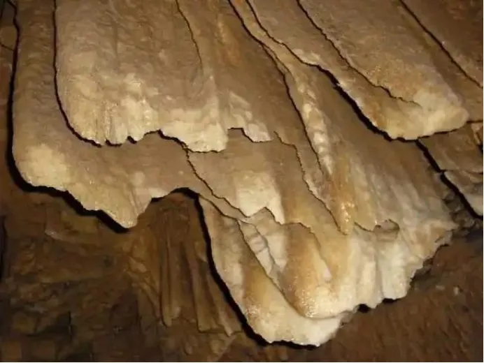 二是石旗:薄而透明的片状、旗状沉积物,边缘呈波浪形,质地脆薄。洞顶倾斜裂隙渗出的水流沿固定方向持续流动,碳酸钙沿路径沉积,同时受洞道定向气流影响,逐渐形成薄而宽的旗状结构。