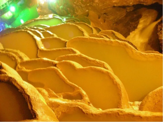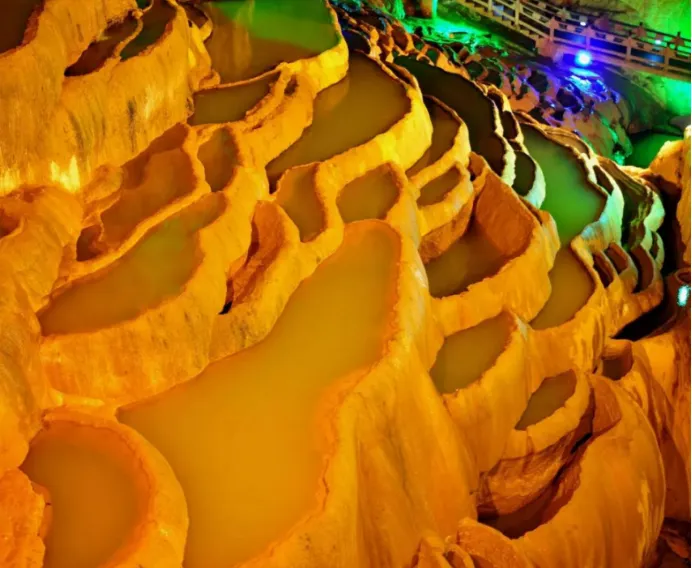 一是边石坝(石田 / 梯田):洞底缓坡上的阶梯状堤埂,弧形向外弯曲,堤内积水成池,形似梯田。当含钙水流漫过积水洼地边缘时,水层变薄、流速加快,CO₂快速逸出,碳酸钙在洼地边缘优先沉积,逐渐形成环状堤埂;堤埂不断增高扩大,逐级向下游发展,最终形成大面积边石坝群。
