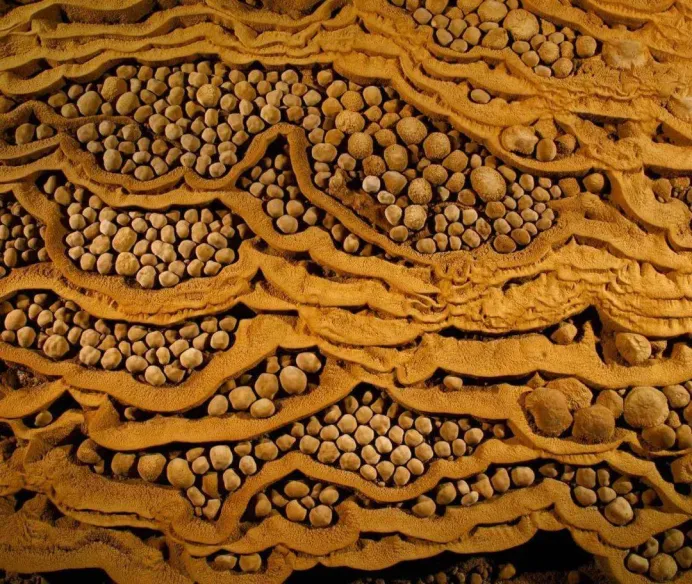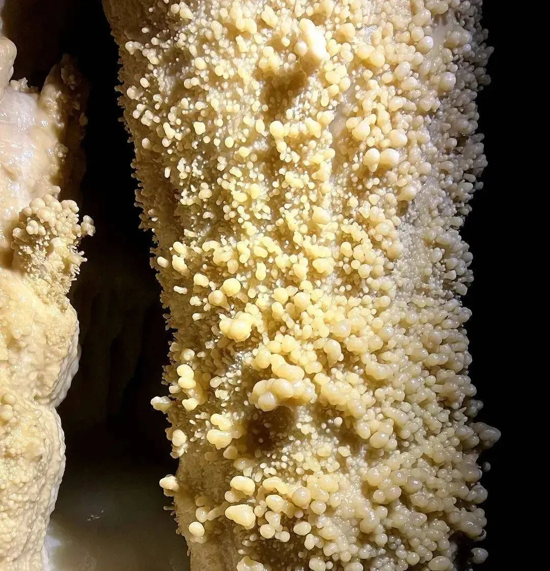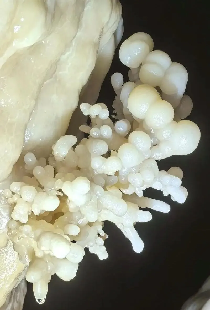 一是石葡萄:洞壁上成串的葡萄状、球状小珠沉积物,直径多不足 1cm。由洞壁凝结水、毛细水、溅水共同作用,碳酸钙在凸起的岩面或沉积物表面逐层沉积,形成串珠状结构。