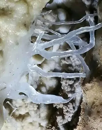 一是卷曲石:沿任意方向弯曲、分叉的枝状、丝状、螺旋状沉积物,生长方向完全偏离重力方向。沉积物表面的毛细水膜在表面张力作用下向任意方向运移,碳酸钙在运移路径上持续沉积,最终形成扭曲、分叉的奇特形态。