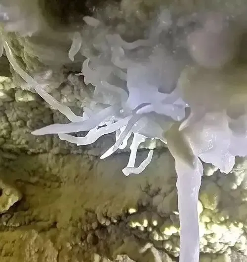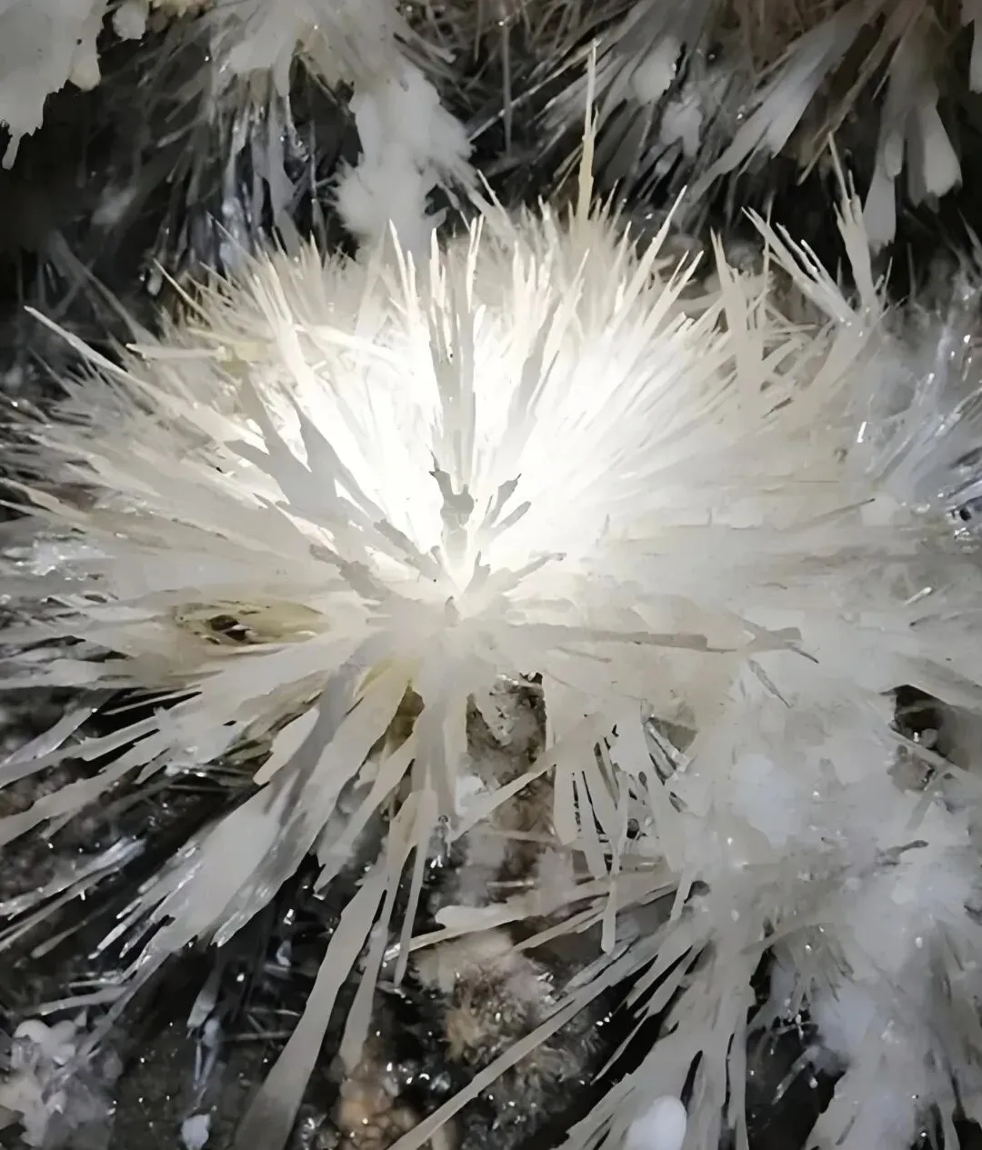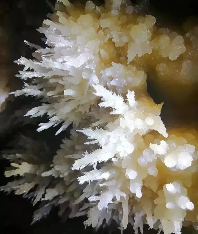 二是晶花(文石花 / 方解石花 / 石膏花):洞壁、沉积物表面的树枝状、放射状、针状、花瓣状晶簇,质地晶莹。毛细水沿岩石孔隙、沉积物缝隙渗出,在高湿度、低气流的环境中,水分缓慢蒸发,矿物晶体持续析出、生长,形成形态各异的晶花集合体。