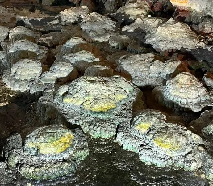 三是溅水沉积(石蘑菇、棕榈片):石笋表面的棕榈状鳞片、洞壁上的蘑菇状沉积物。水滴跌落产生的飞溅水,在周边岩壁、石笋表面附着,CO₂逸出后碳酸钙沉积,长期累积形成特殊形态。