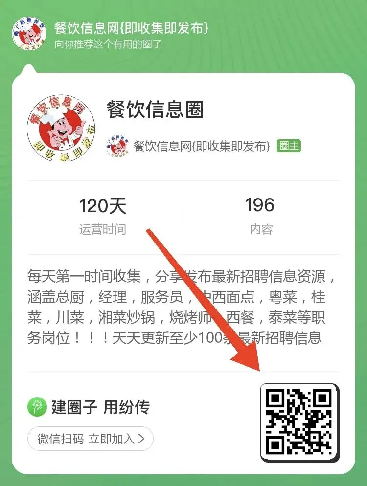 因公众号每天只能更新一次,导致有很多招聘信息资源没能第一时间更新发布,所以特意创建了一个纷传餐饮招聘信息圈子,方便找工作的餐饮厨师同行,主要是发布广西区域,广东区域,日料寿司刺身和省内精选信息,公众号没有的,圈子里面都有,如果大家对于招聘信息资源需求比较多,可以选择点击下方小程序加入餐饮信息圈!每日至少提供100条以上最新招聘!!!目前定价是10元一个月,2个月18元,按天算一天才3毛钱,每天花3个多小时时间。本质也是等价交换,如果觉得值,并且需要更多资源,可以点击下方小程序加入一下吧!