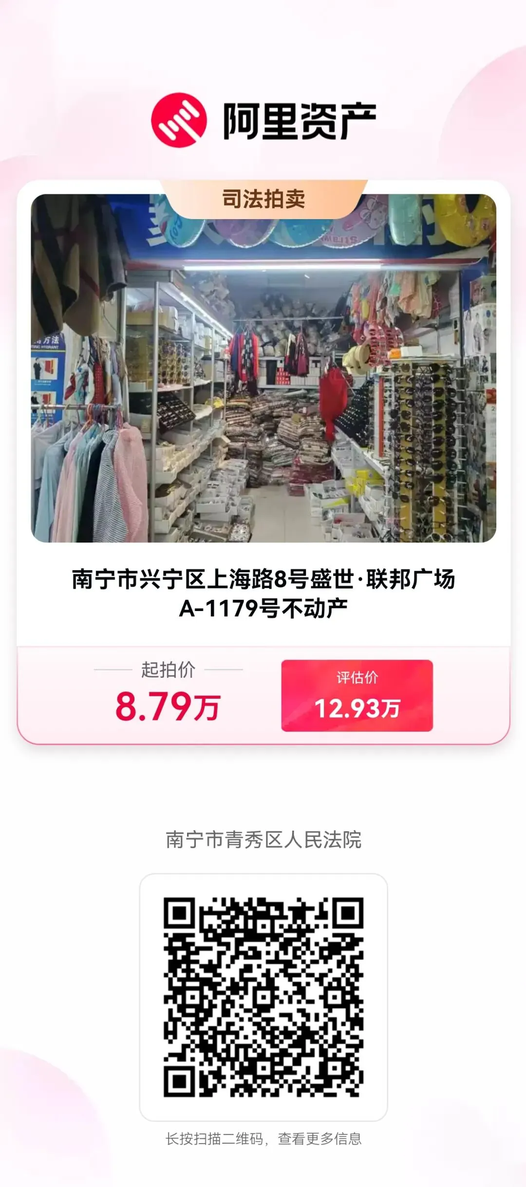 南宁市青秀区人民法院定于2026年4月15日10时00分到2026年4月16日10时00分(延时的除外)在淘宝网网络司法拍卖平台对南宁市兴宁区上海路8号盛世·联邦广场A-1179号不动产进行网络公开拍卖。