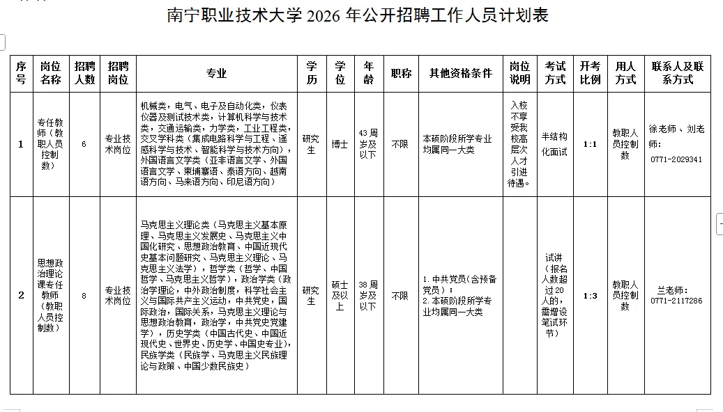 1.开考比例。招聘岗位对应开考比例详见《南宁职业技术大学2026年公开招聘工作人员计划表》。开考比例为1:3方可开考;若达不到1∶3但确急需进人的,经核准后可核减招聘计划或降低开考比例至1∶2开考,仍旧达不到开考比例的则取消对应岗位的招聘计划。进入考试环节的应聘人员如不按时参加现场资格审核及考试的,取消考试资格。