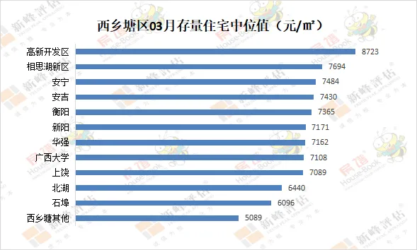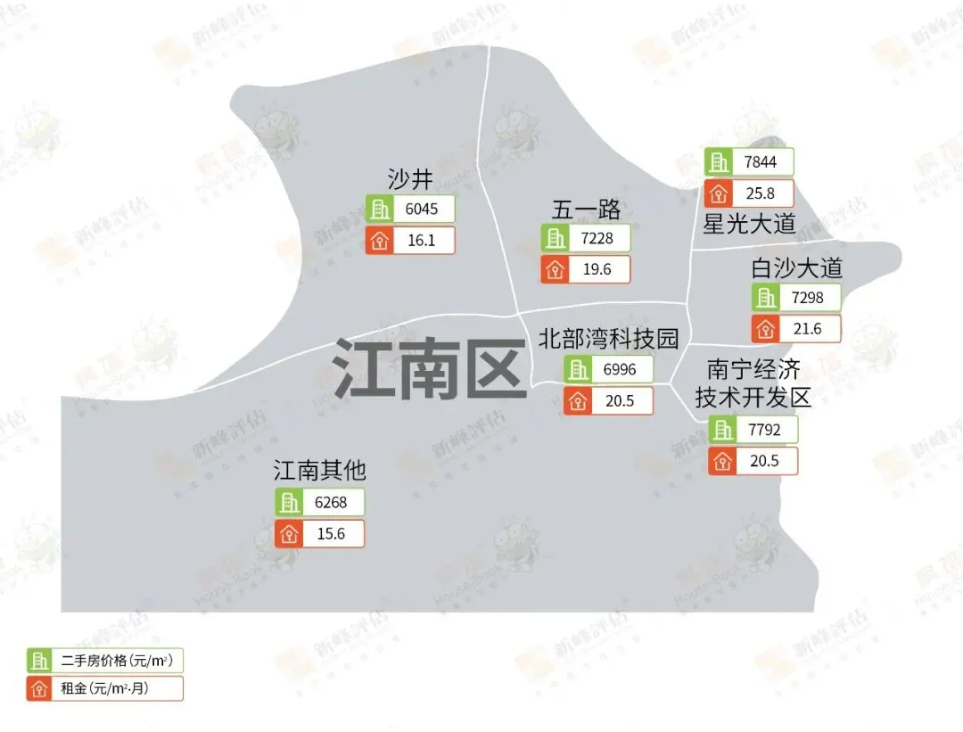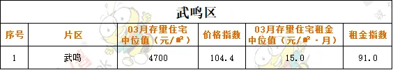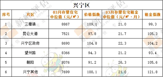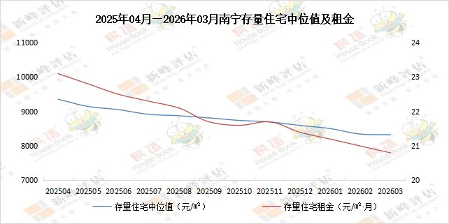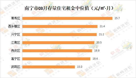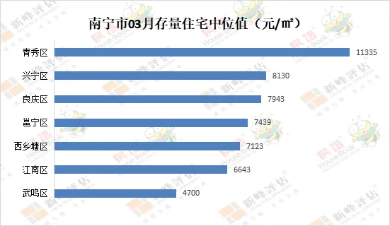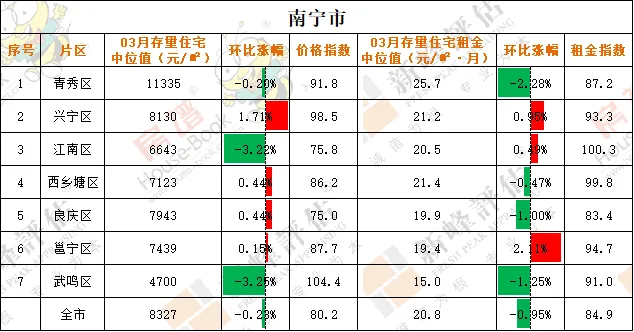 2026年03月南宁市存量住宅中位值8327元/㎡,环比下降0.23%;存量住宅租金中位值20.8元/㎡·月,环比下降0.95%。03月青秀区存量住宅中位值为11335元/㎡,环比下降0.2%。存量住宅租金中位值为25.7元/㎡·月,环比下降2.28%。03月良庆区存量住宅中位值为7943元/㎡,环比上升0.44%。存量住宅租金中位值为19.9元/㎡·月,环比下降1%。03月江南区存量住宅中位值为6643元/㎡,环比下降3.22%。存量住宅租金中位值为20.5元/㎡·月,环比上升0.49%。03月兴宁区存量住宅中位值为8130元/㎡,环比上升1.71%。存量住宅租金中位值为21.2元/㎡·月,环比上升0.95%。03月西乡塘区存量住宅中位值为7123元/㎡,环比上升0.44%。存量住宅租金中位值为21.4元/㎡·月,环比下降0.47%。03月邕宁区存量住宅中位值为7439元/㎡,环比上升0.15%。存量住宅租金中位值为19.4元/㎡·月,环比上升2.11%。03月武鸣区存量住宅中位值为4700/㎡,环比下降3.25%。存量住宅租金中位值为15元/㎡·月,环比下降1.25%。说明:本文指数以2018年3月为基期价格测算,基期价格为100。