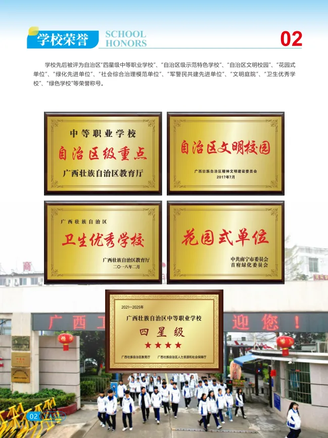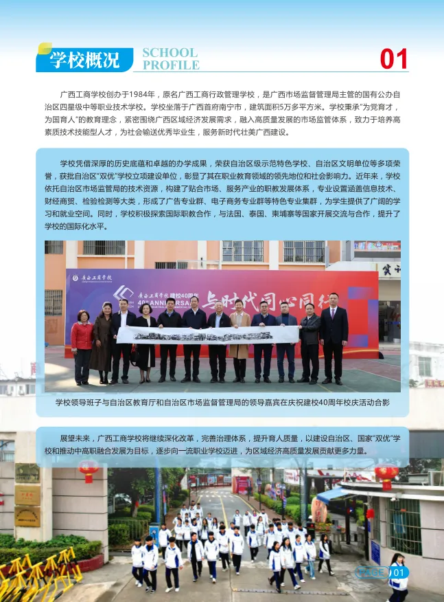 广西工商学校创办于1984年,原名广西工商行政管理学校,坐落于风景秀丽的广西首府南宁市,是广西壮族自治区市场监管局主管的国有公办自治区四星级重点中等职业学校。作为自治区优质中等职业学校和专业B类立项建设单位,学校还荣获了自治区级示范特色学校、自治区文明校园、广西绿色学校、花园式单位、绿化先进单位、社会综合治理模范单位、文明庭院、卫生优秀学校等一系列荣誉称号。