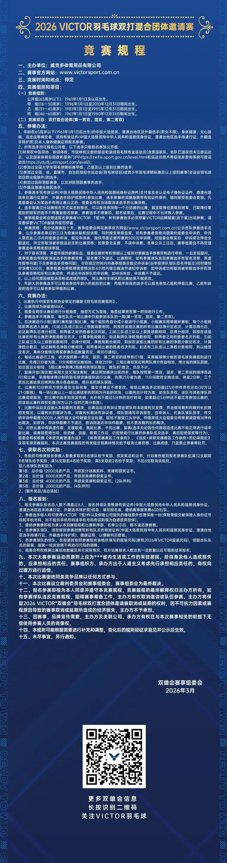 赛事官方网站:www.victorsport.com.cn比赛地点:广西壮族自治区南宁市兴宁区邕宾立交桥长旺装饰材料市场威克多·长鸿羽毛球馆报名时间:即日起-2026年4月28日下午18:00止报名咨询:徐先生13070227951(微信同号)饶先生18682254710(微信同号)