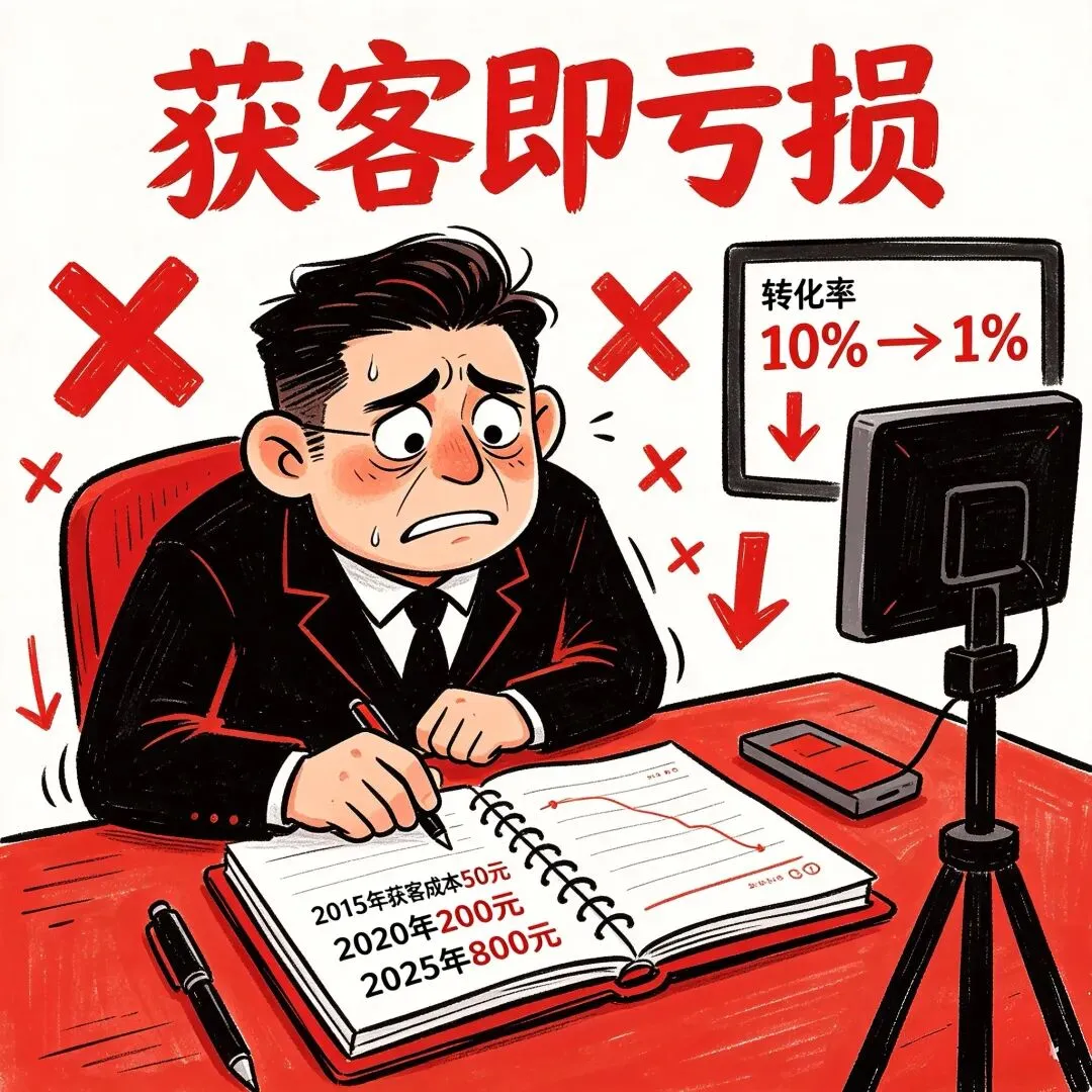 2015年,获取一个电商新用户的成本大约是50元;2020年,这个数字涨到了200元;到2025年底,主流平台的获客成本已经突破800元,部分行业甚至高达1500元。这不是增长,这是指数级恶化。而“直播转化率从10%跌至1%”。这意味着,我们正陷入一场 “获客即亏损” 的集体迷局。