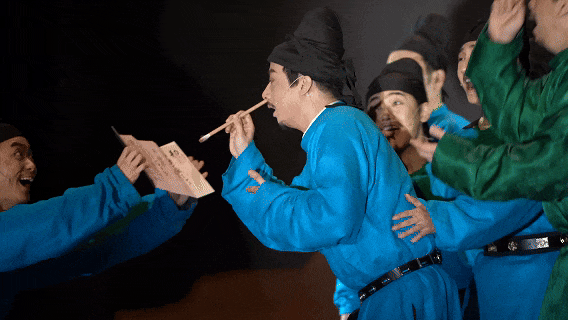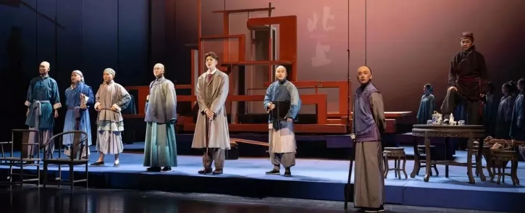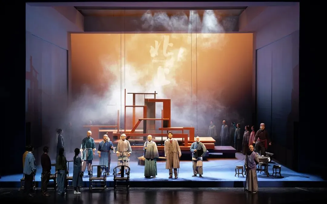 水波为曲,桨帆为歌,辅以灯光、多媒体的融汇,现代且诗意的舞台语汇铺满整个舞台。舞美设计刘科栋打破船的常规想象,用榫卯结构在舞台拼接出一艘充满思辨性和多义性的“船”,千变万化,推动故事层层展开;灯光设计曲明与多媒体设计王佳迪默契配合,在富有纵深感的舞台上开辟古、今两个演区,实现跨越时空的并置;人物造型设计尹玲从无到有,以衣衫塑精神,留下数位个性鲜明的角色形象;作曲设计于力、音响设计丁盼,将运河的开阔与厚重都蕴藏于贯穿作品的动机中,奏响历史的根音。