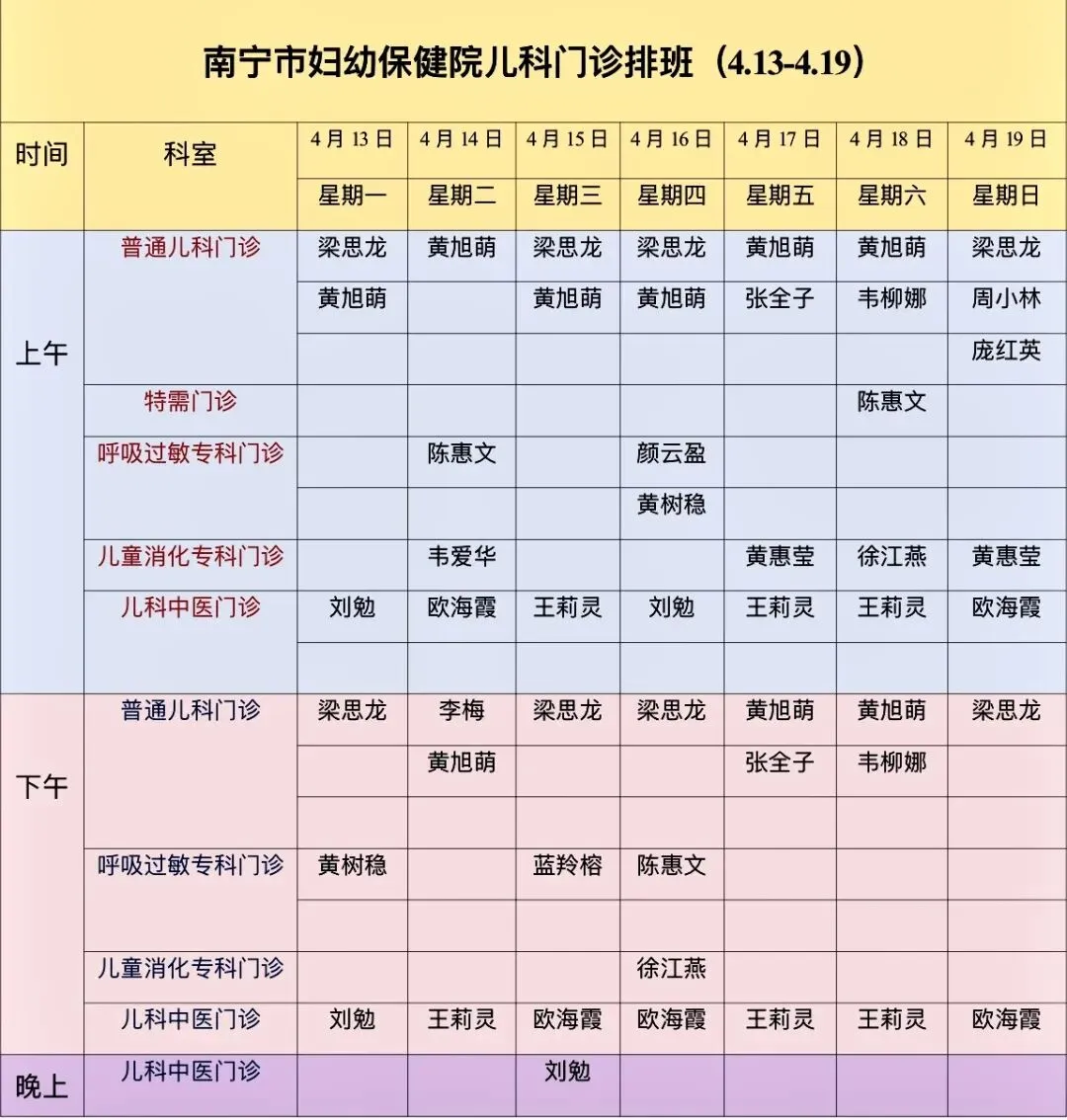 南宁市妇幼保健院儿科门诊医生排班表(4月13日~4月19日)
