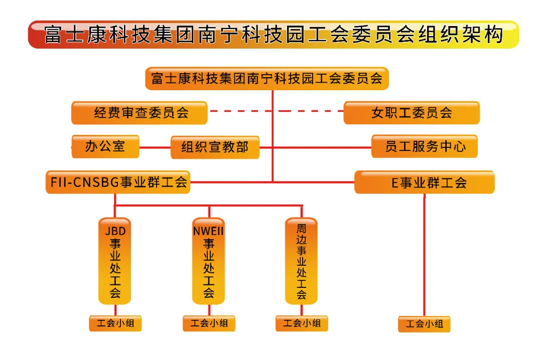 富士康科技集团南宁科技园工会委员会成立于2012年12月12日,选举产生第一届工会委员会、经费审查委员会、女职工委员会,同时成立了职代会四个专门委员会。目前工会组织设有3个职能部门:办公室、组织宣教部、员工服务中心,下辖FII-CNSBG事业群工会、E事业群工会,现有专职工会干部8人。