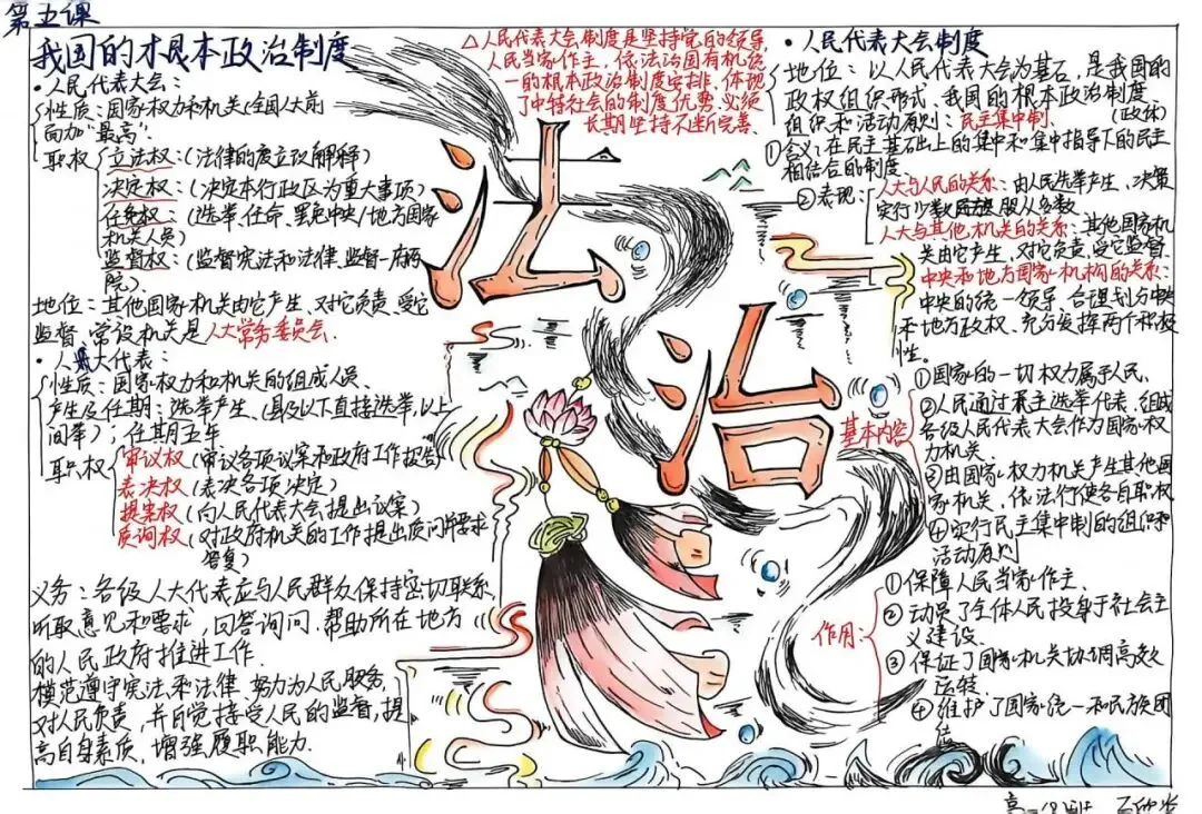 人民代表大会制度作为我国的根本政治制度,理论性强且逻辑关系紧密。本次比赛以思维导图为载体,引导学生摒弃机械记忆,主动梳理知识脉络、厘清概念关联,将抽象的学科知识转化为层次分明、重点突出的可视化成果。同学们在绘制过程中研读教材、优化框架,理清了人民、人大代表、人民代表大会与人民代表大会制度的内在联系,既夯实了知识基础,又提升了逻辑思维与自主学习能力,深刻理解了我国根本政治制度的核心要义。