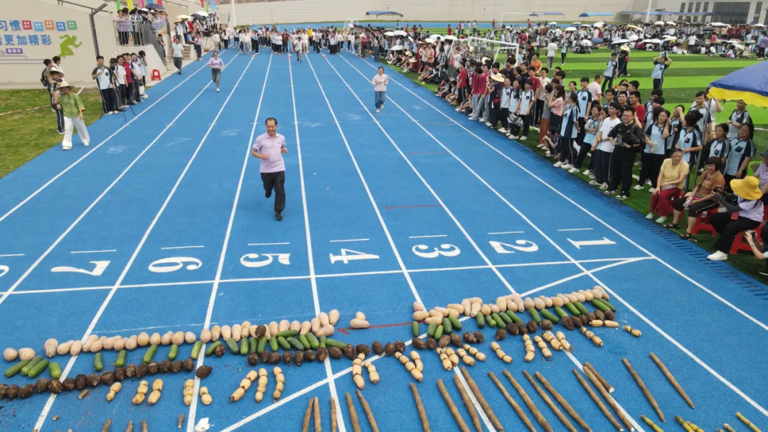 田径比赛结束后,趣味运动环节正式拉开帷幕,为本次校运会增添了更多欢乐氛围。教职工“占岭鲜滋味”抢果蔬比赛中,每个代表队每次派1名队员从起点出发,快速跑到果蔬摆放区,拿起一种果蔬后迅速跑回起点,其他队员依次完成接力。老师们放下平日里的严谨,踏上蓝色跑道,挥洒豪情、奋力奔跑、认真抢摘,赛场上欢声笑语不断。他们用行动告诉学生,人生的赛道上,唯有全力以赴,方能不负热爱。