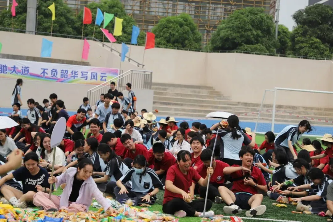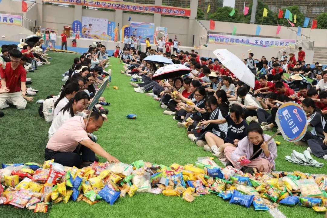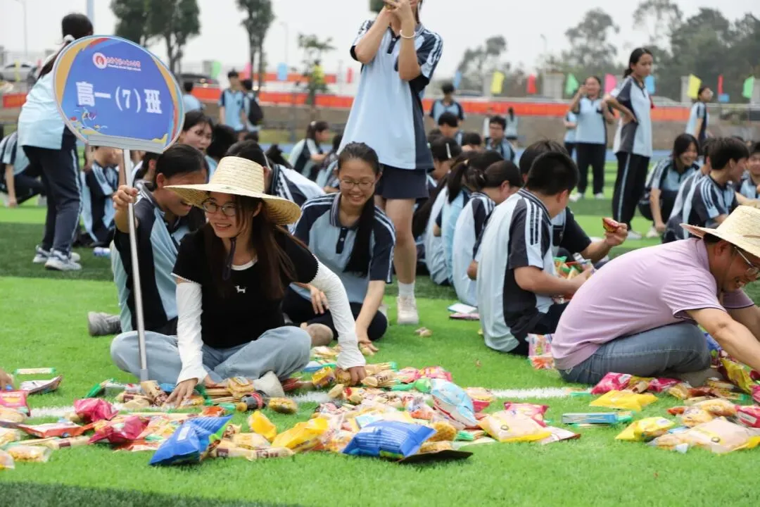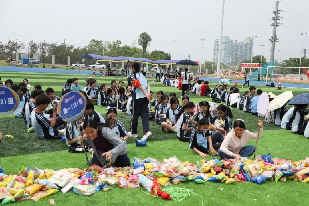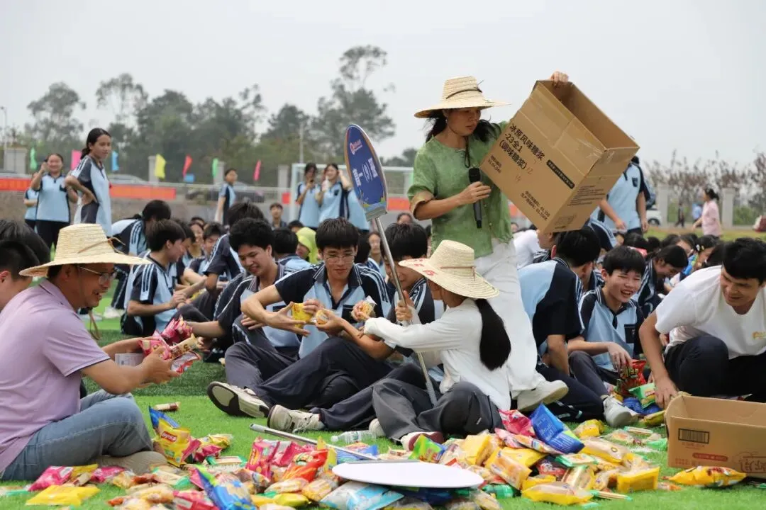 学生趣味运动项目是“占岭食力派”抢零食大赛:班主任带领本班学生排成一列纵队按指定顺序围坐在足球场中间的零食圈外,比赛时,班主任手持班牌,端坐原位,用单手取到一种零食后立刻向后传递给本班学生。大家齐心协力,争夺属于班级的“小惊喜”。