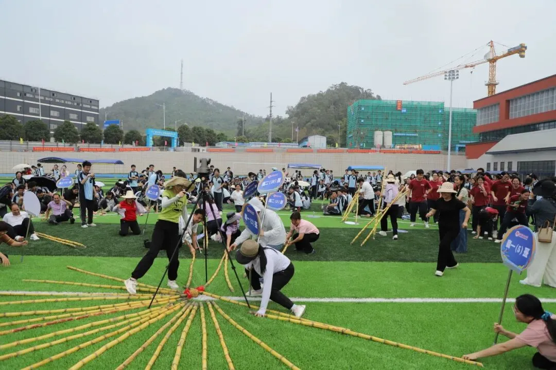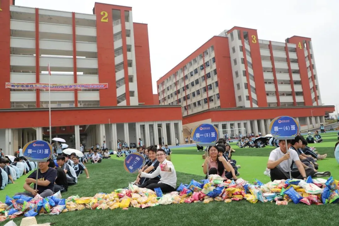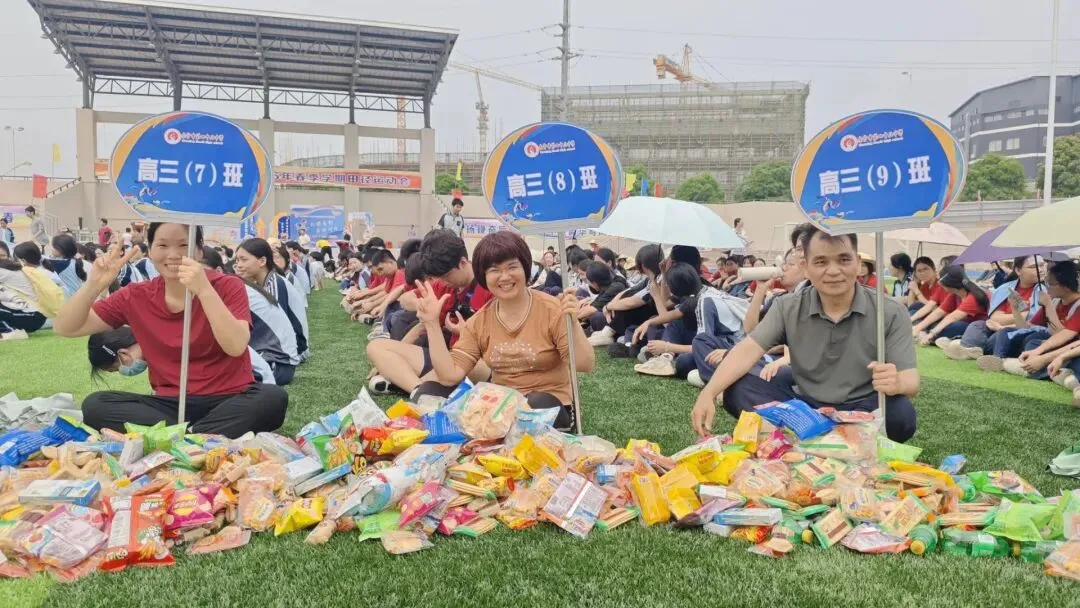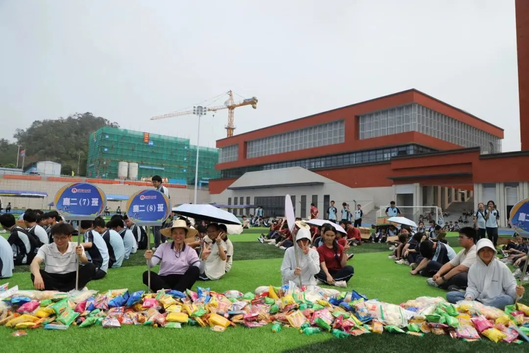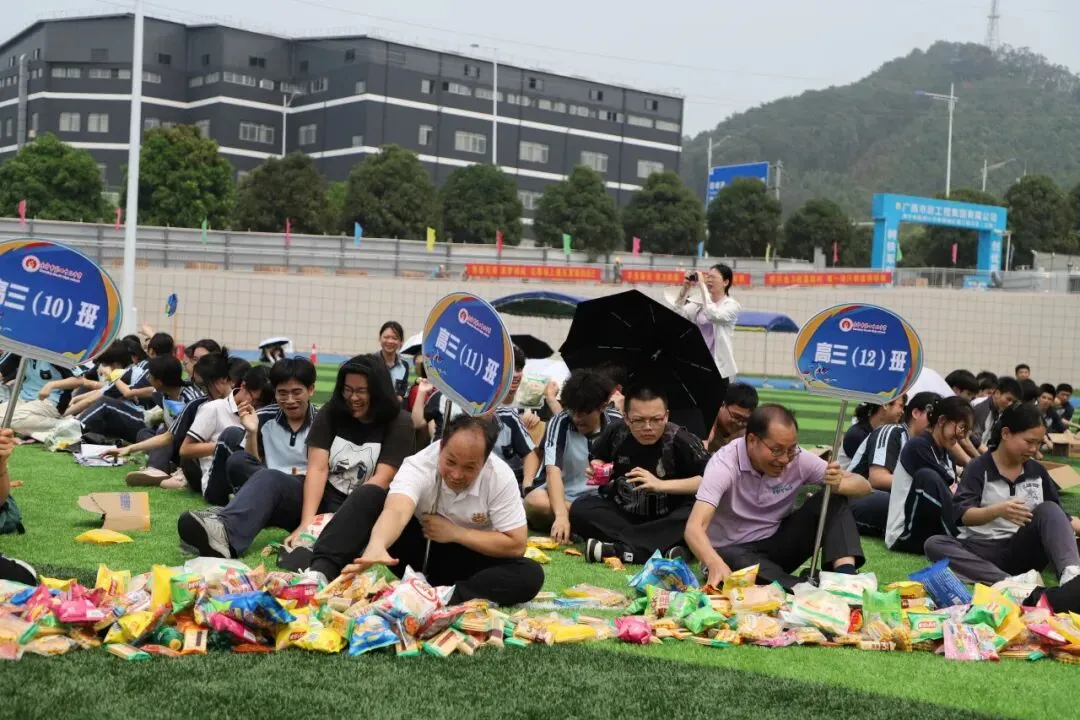 学生趣味运动项目是“占岭食力派”抢零食大赛:班主任带领本班学生排成一列纵队按指定顺序围坐在足球场中间的零食圈外,比赛时,班主任手持班牌,端坐原位,用单手取到一种零食后立刻向后传递给本班学生。大家齐心协力,争夺属于班级的“小惊喜”。