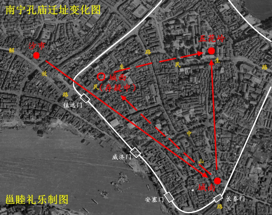 谢明之在南宁任职时,看到了南宁孔庙所处的位置以及布局,既不符合朝廷颁布的营建标准,也不符合礼制要求,所以便要另寻新址。而谢明之最终选定五花岭(南宁饭店)作为南宁孔庙的新址,便是看中了此处的风水宝地。笔者在《》一文中已有说明。但谢明之却在迁建时过于匆忙,考虑不周,以致未能遵循标准与礼制进行重建,留下了遗憾。《邕州重建儒学记》载“当时郡侯谢公明之急于改张,前后左右俱失其伦,规模体制犹未尽善。”(白话文:当时州长谢明之急于改变现状,使得重建后的文庙在前后左右的布局上皆不符合要求,整体的等级与数量都还不够好。)就这么将就着过了20多年,直至梁应龙的到来,事情才有了进展。