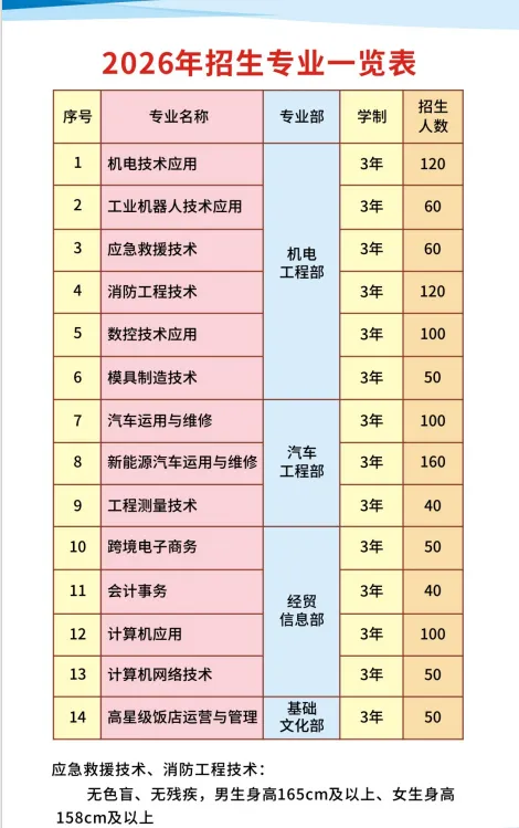 开设专业:开设有机电技术应用、工业机器人技术应用、应急救援技术、消防工程技术、数控技术应用、模具制造技术、汽车运用与维修、新能源汽车运用与维修、工程测量技术、建筑工程施工、跨境电子商务、会计事务、物流服务与管理、计算机应用(平面设计方向)、计算机网络技术、高星级饭店运营与管理等16个专业,覆盖资源环境与安全、土木建筑、装备制造、电子与信息、财经商贸、旅游及交通运输七大领域。