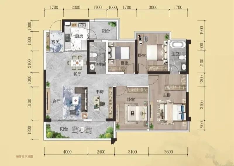 这个户型让我感到很意外,119做到了四房的同时还有6.4米大横厅,如果想做5房,客厅开间仍然还有4米,实用面积达到130+,算是南宁市赠送面积里面比较多的了。