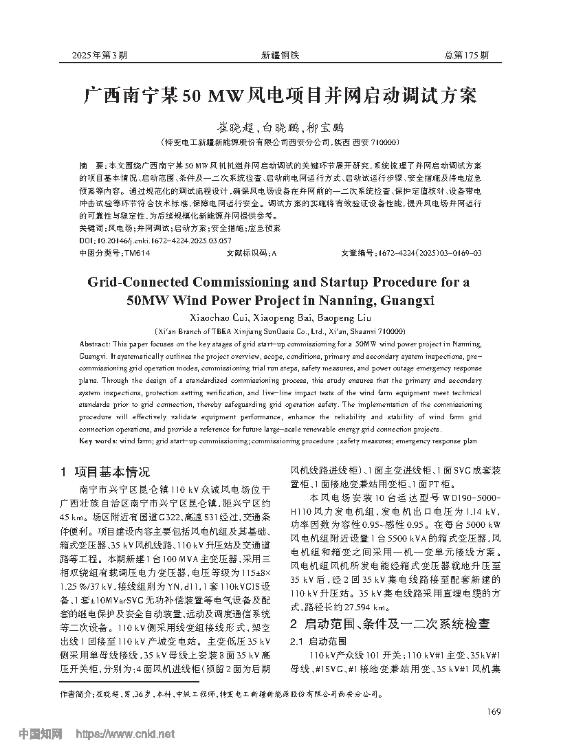 广西南宁某50MW风电项目并网启动调试方案