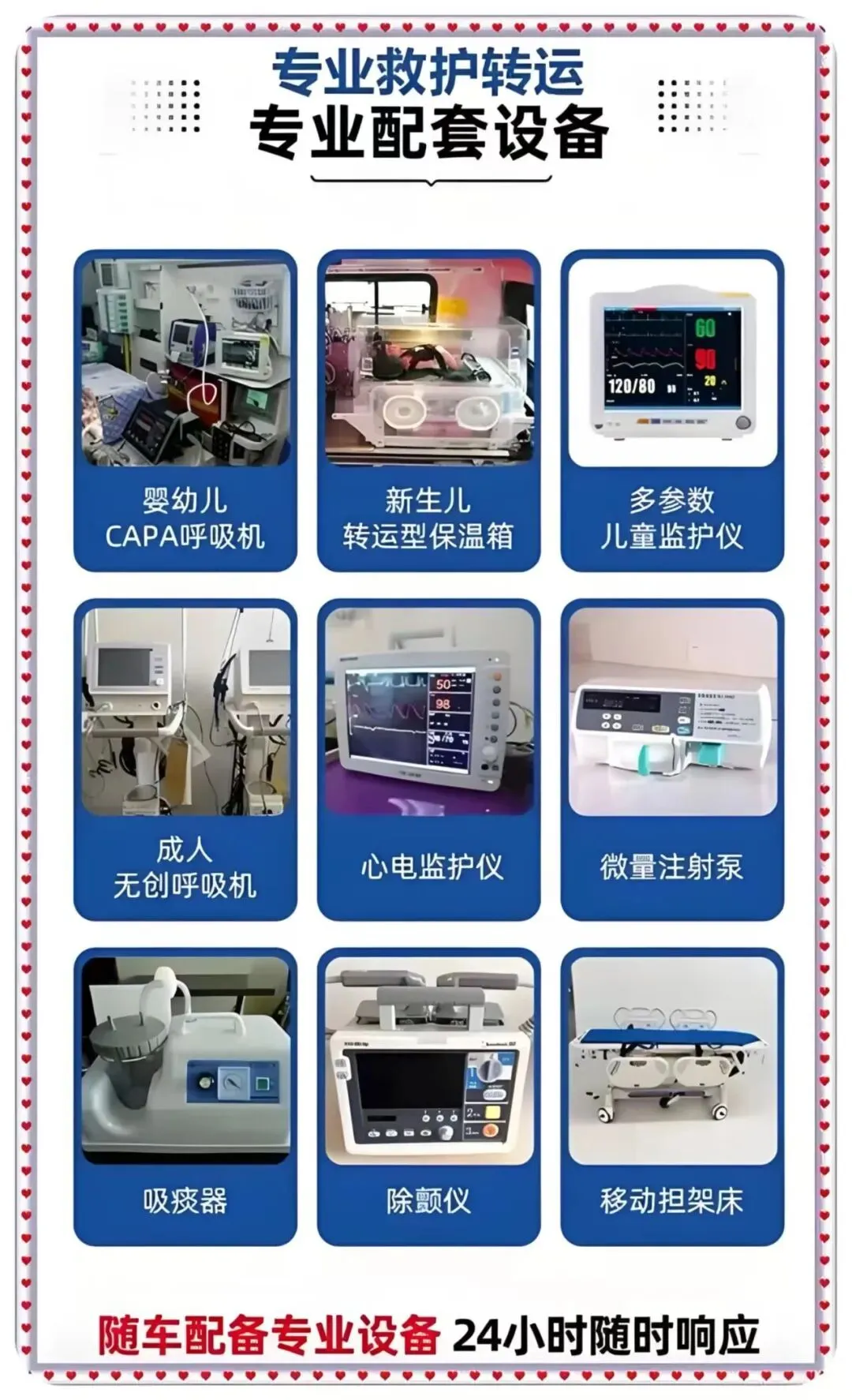 中福救护车出租转运公司,120非急救救护车接送病人预约护送。24小时为术后康复、危重患者及跨区域就医人群提供专业医疗转运服务,提供120救护车出租‖救护车转运‖私人120救护车(非急救)‖跨省长途转运‖危重病人转运‖市内转运‖术后康复病人转运‖高铁病人转运‖患者返乡‖大型活动赛事保障‖配备ICU设备:呼吸机▪心电监护仪▪吸痰器•微量泵•氧气▪急救药箱▪专业医护团队;就近派车