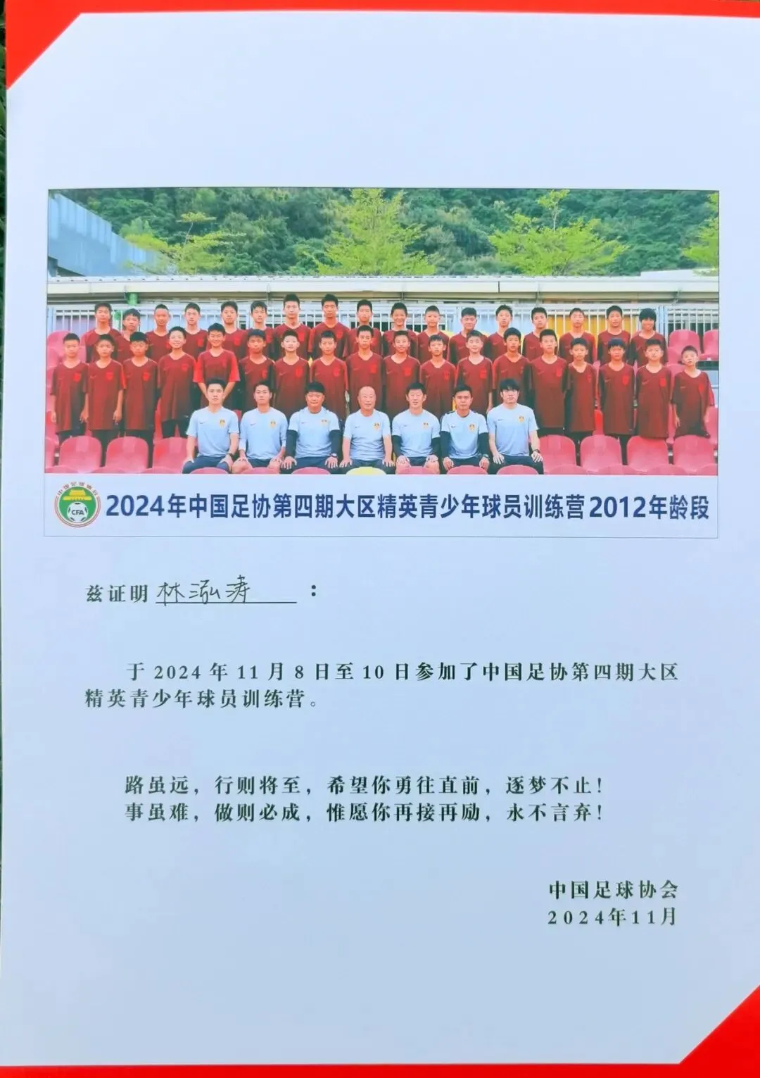 经过长达两年的层层选拔、多轮考核与全国精英球员的激烈角逐,中国足协 2026 年第一期男子青少年球员全国训练营(2012 年龄段)最终 40 人名单正式出炉,广西南宁足球小将林泓涛凭借扎实的技术、稳定的赛场表现与顽强的拼搏精神成功入选,成为本次全国精英训练营中来自南宁的亮眼新星。