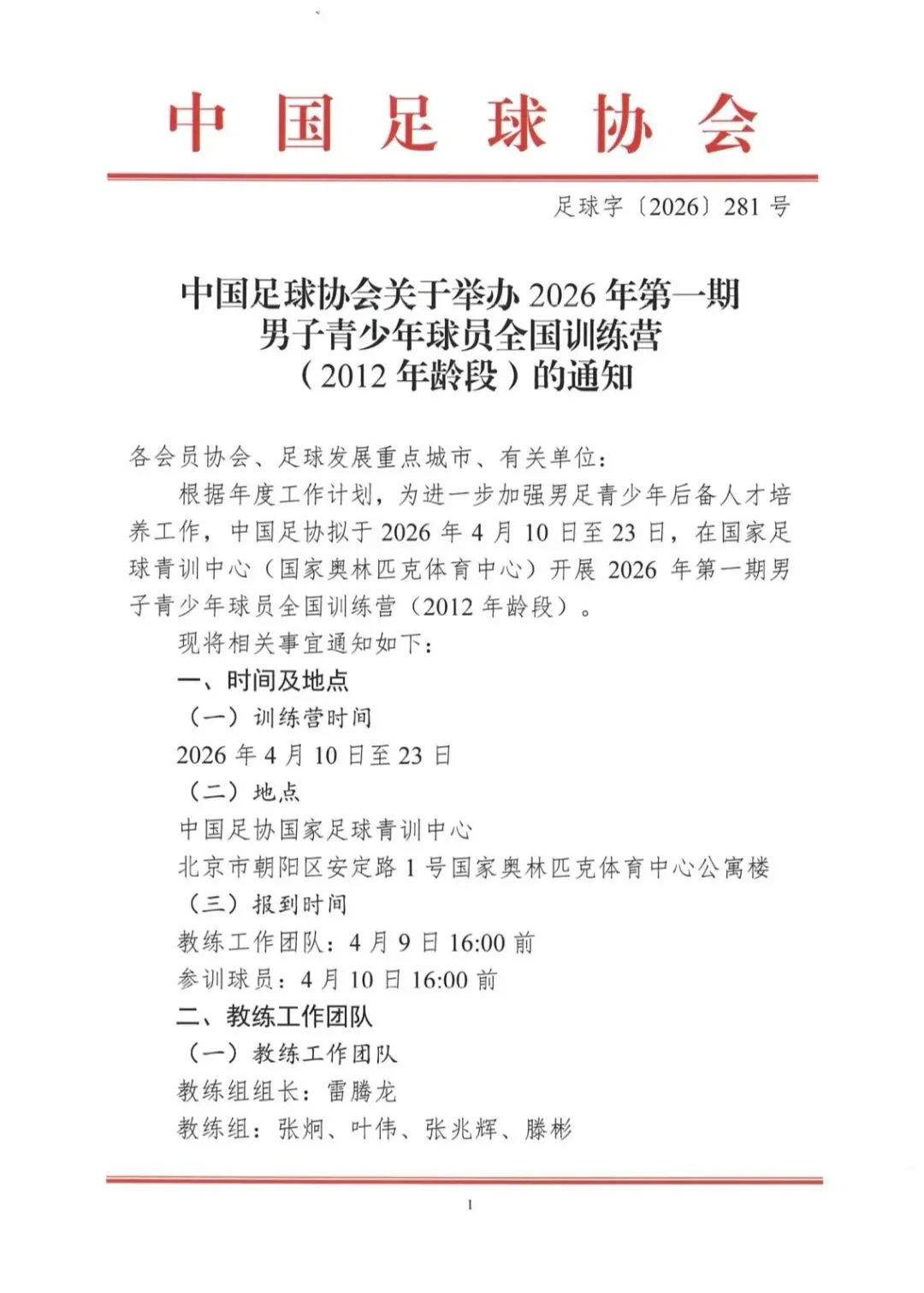 本次训练营由中国足协主办,于4月10 日至 23 日在北京国家足球青训中心(奥体中心)举行,是国内 2012 年龄段男足青训体系中规格最高、选拔最严的集中培训平台之一微博。训练营汇聚全国同年龄段最具潜力的 40 名球员,通过系统训练、教学比赛、技术分析、科研监测与文化教育相结合,搭建精英球员数据库,为中国足球后备人才梯队建设夯实基础。