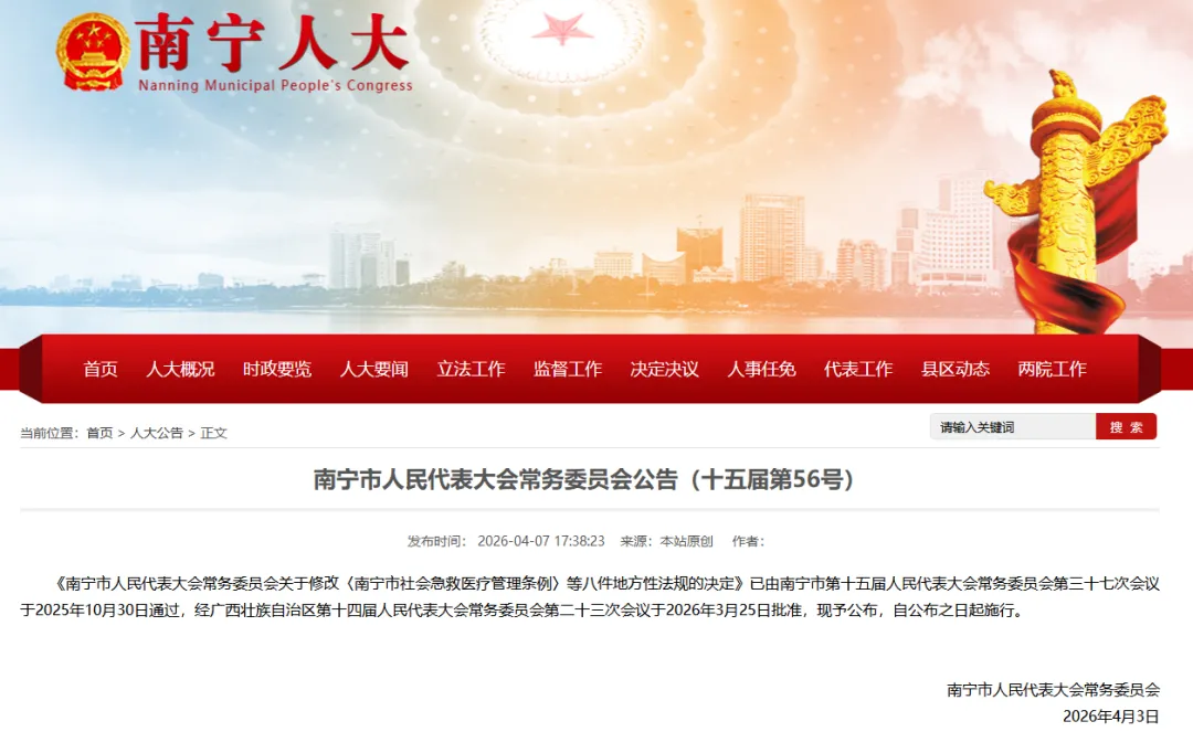 《南宁市人民代表大会常务委员会关于修改〈南宁市社会急救医疗管理条例〉等八件地方性法规的决定》已由南宁市第十五届人民代表大会常务委员会第三十七次会议于2025年10月30日通过,经广西壮族自治区第十四届人民代表大会常务委员会第二十三次会议于2026年3月25日批准,现予公布,自公布之日起施行。