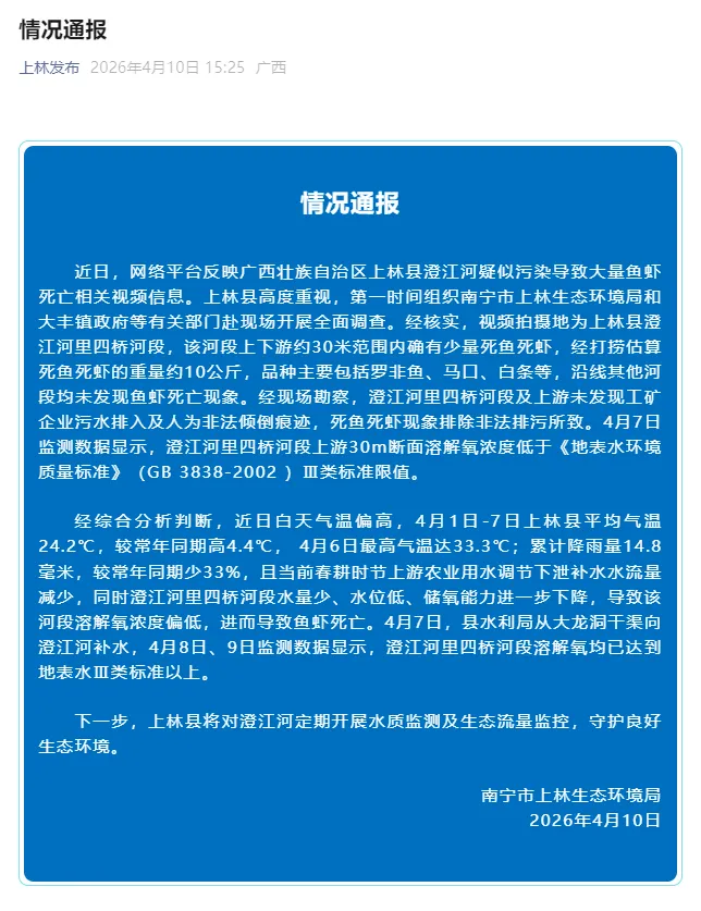 通报称,经核实,视频拍摄地为上林县澄江河里四桥河段,该河段上下游约30米范围内确有少量死鱼死虾,沿线其他河段均未发现鱼虾死亡现象。经现场勘察,澄江河里四桥河段及上游未发现工矿企业污水排入及人为非法倾倒痕迹,死鱼死虾现象排除非法排污所致。4月7日监测数据显示,澄江河里四桥河段上游30m断面溶解氧浓度低于《地表水环境质量标准》(GB 3838-2002 )Ⅲ类标准限值。