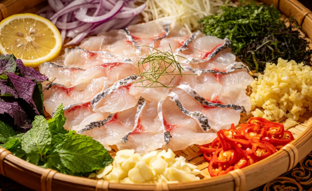 在鼓鸣寨游玩过后,一定不能错过横州鱼生,薄如蝉翼的鱼片搭配丰富配菜,口感清爽鲜甜,是横县美食的一绝。