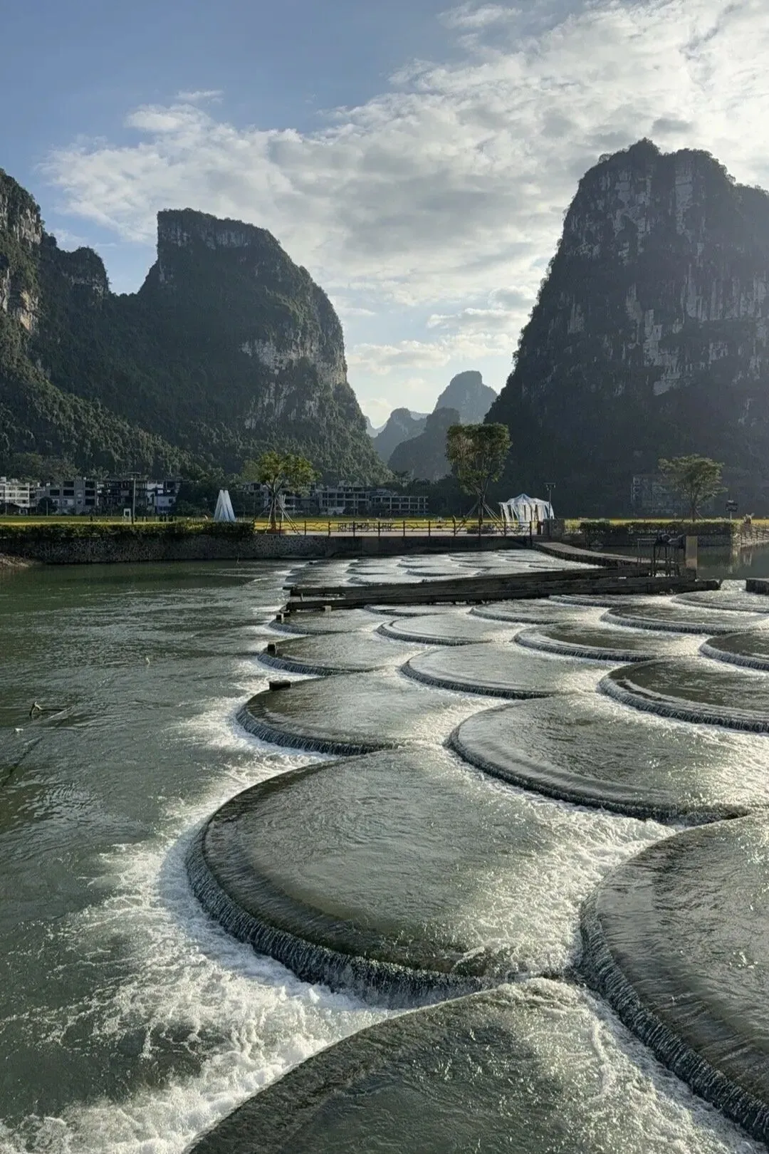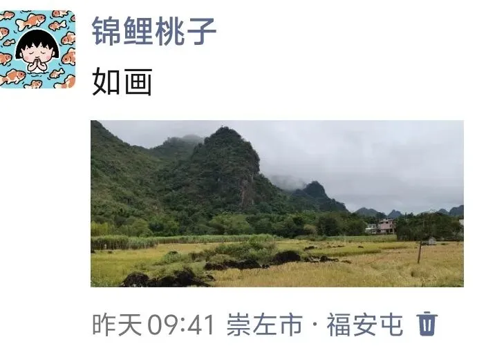 如果你时间充裕,可以在崇左住上一晚,第二天去明仕田园看看。这里被称为"小桂林",风景美得不像话!翠竹绕岸,农舍点缀,独木桥横跨碧水,远处青山如黛,真的就像"人在画中游"。日出和日落格外迷人。