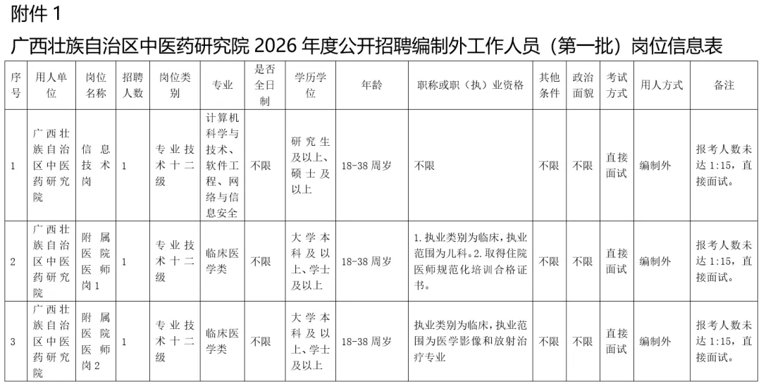 附件:1.广西壮族自治区中医药研究院2026年公开招聘编制外工作人员(第一批)岗位信息表
