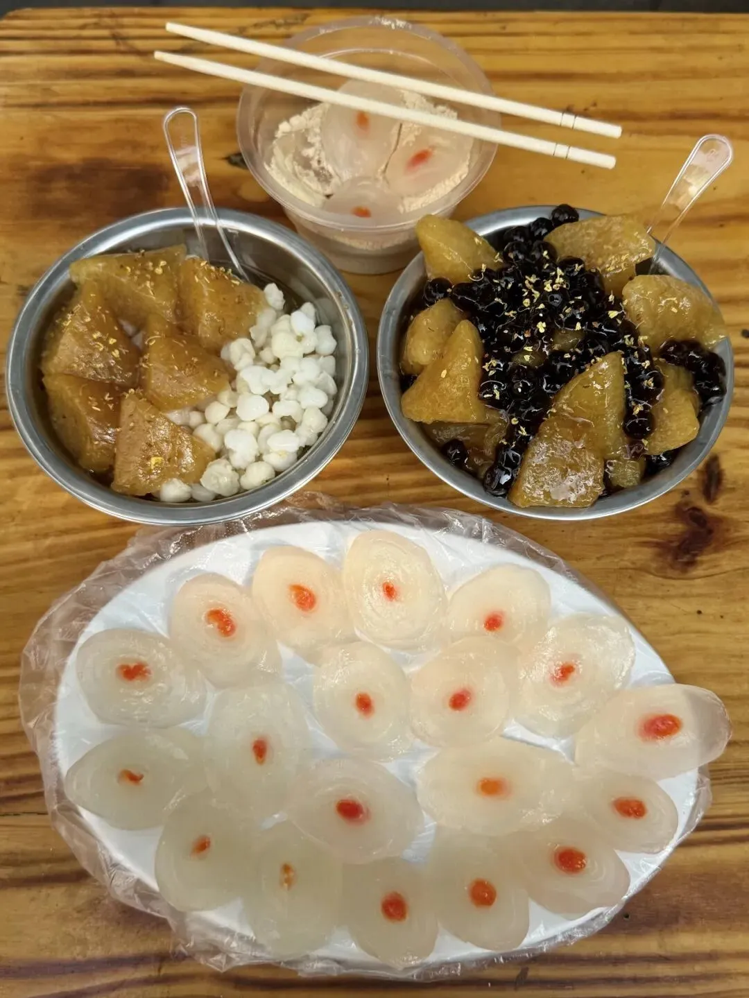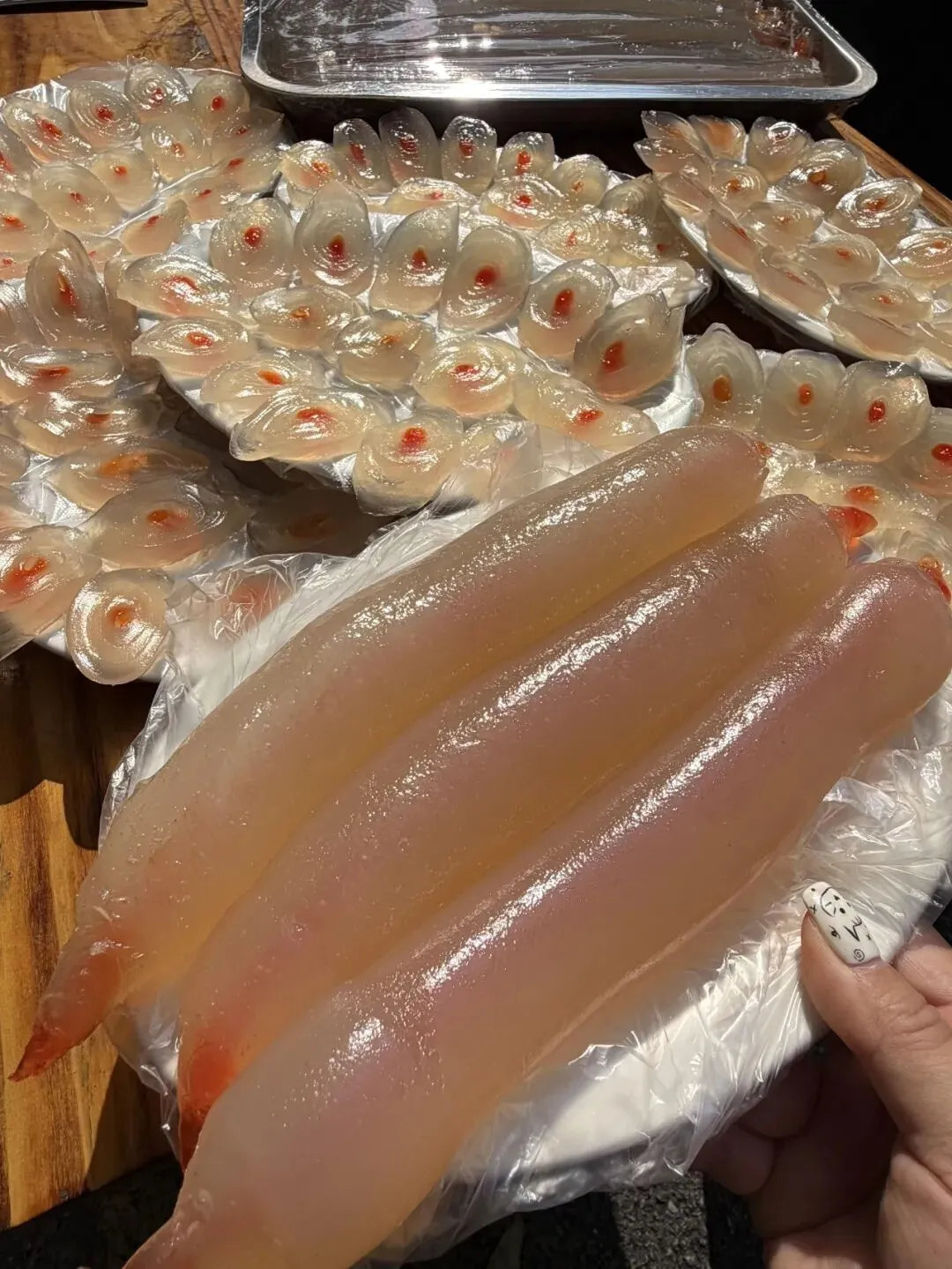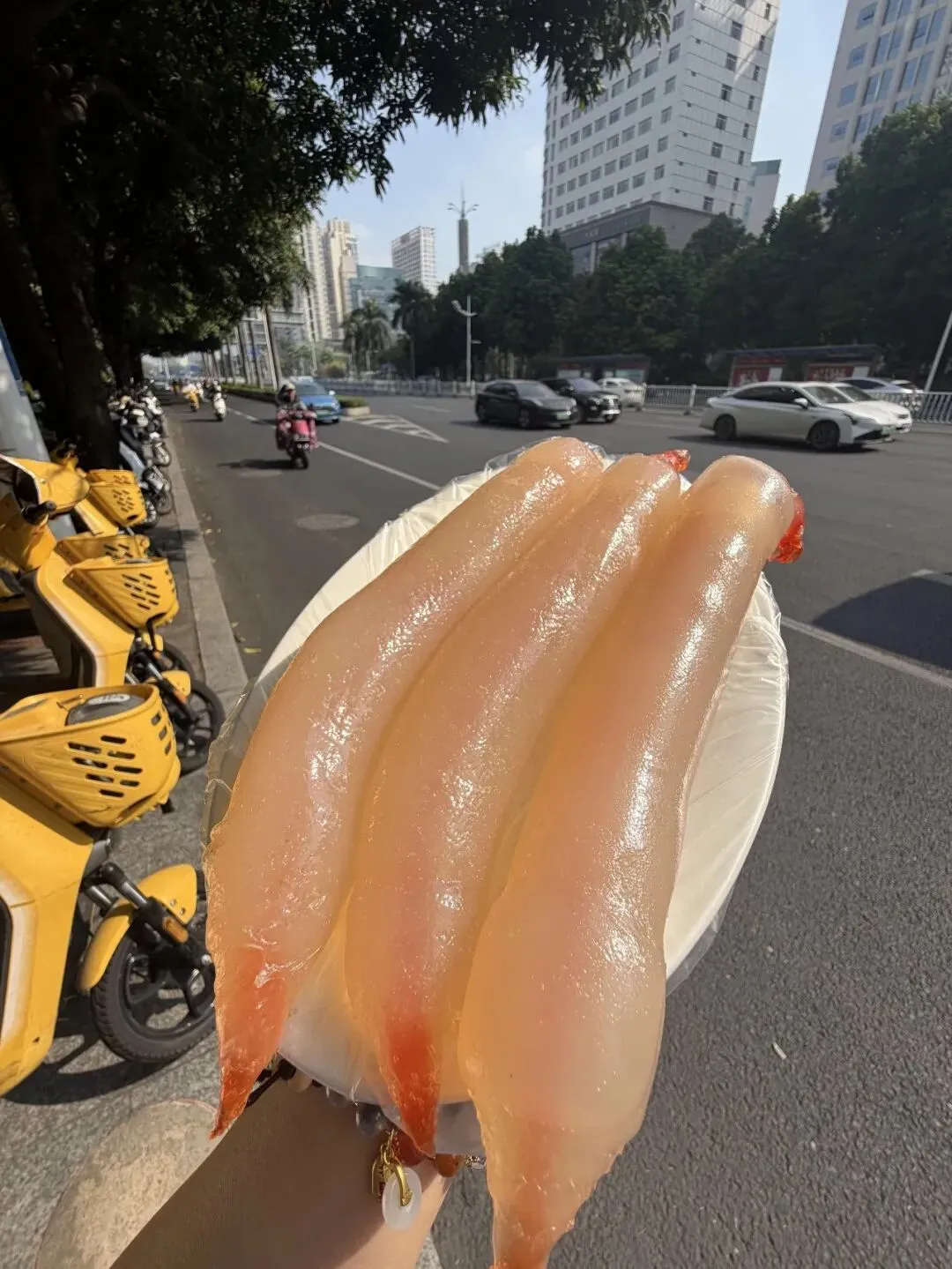 老远我就瞅着摊主摆这一盘,透透的还带红尖尖,长条条粉润润的,我差点扭头就走,这咋还摆生鱼片卖啊?我明明站的是糖水摊啊!