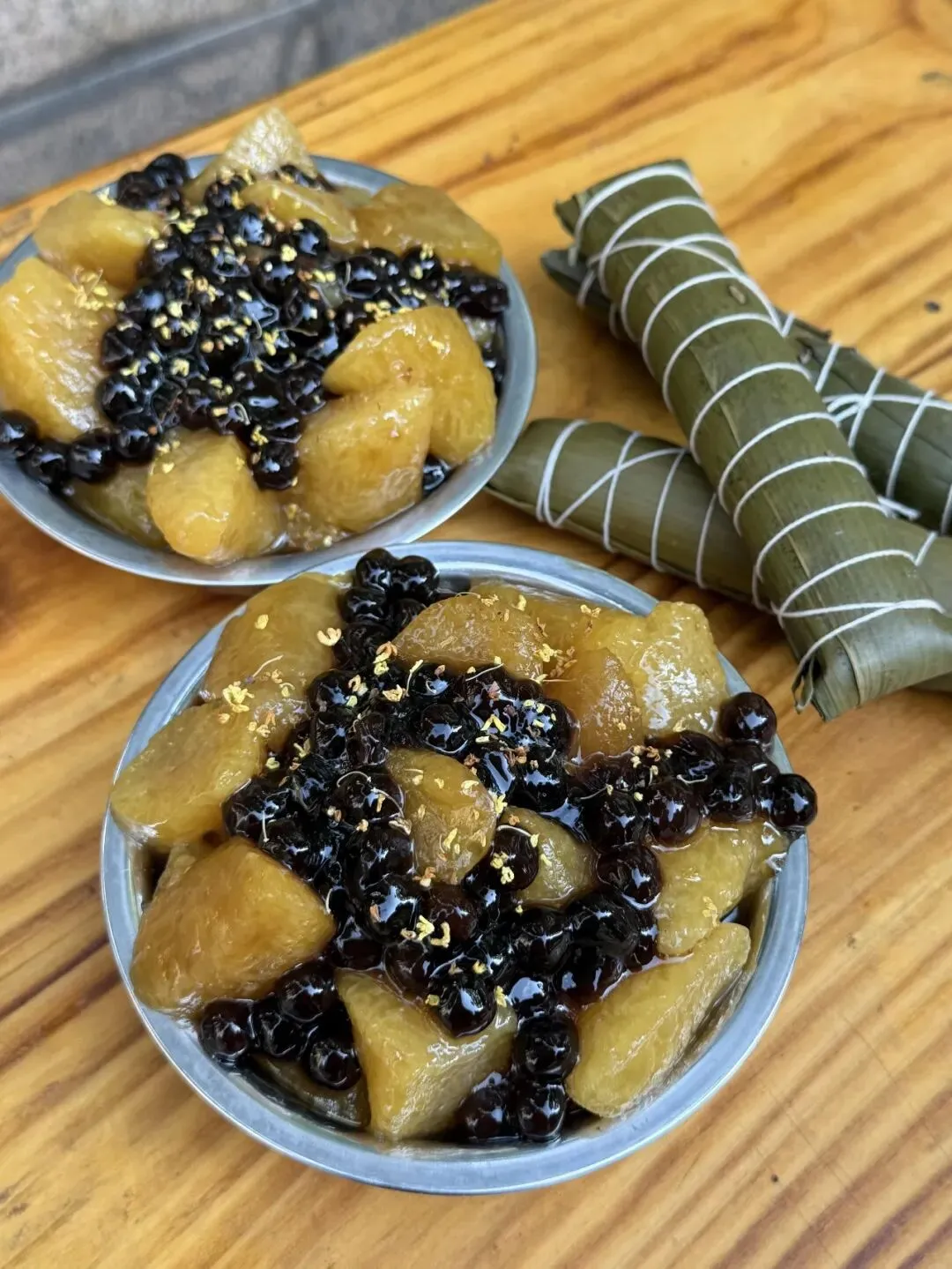 还点了那个玉米粽糖水,我的妈呀,玉米都煮到炸开花了,炖得沙沙绵绵的,吸满了糖水之后甜得入味,配着这个吃,巨解馋,天热吃这个整个人都凉下来了,太舒服了。