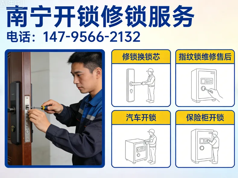 服务项目更全面: 🔑 开锁服务:防盗门、入户门、卧室门、房间门、卫生间门、厨房门、木门、铁门、玻璃门、地弹簧门、商铺门、办公室门开锁;保险柜、家用保险箱、办公密码柜、铁皮文件柜、抽屉柜开锁;汽车门锁、后备箱锁、智能车锁应急开锁等。 🔑 换锁服务:超 C 级防盗锁芯、全铜锁芯、防盗门锁体、大门把手、室内门锁、卧室门锁、卫生间门锁、玻璃门锁、地锁、拉手锁、插芯锁、智能指纹锁整机更换等。 🔑 修锁服务:锁体卡顿、钥匙拧不动、钥匙插不进、锁舌不回弹、关门不严、门下垂异响、反锁卡死、门打不开、钥匙断裂在锁芯内取断钥匙、锁具松动维修等。 🔑 智能锁服务:指纹锁维修、密码锁维修、人脸识别锁故障处理;指纹锁安装、旧锁改装、免改孔安装;智能锁换电池、应急开锁、密码重置、指纹不识别、死机报错、系统恢复等全流程服务。 服务区域全覆盖:青秀区、西乡塘区、江南区、兴宁区、良庆区、邕宁区、武鸣区,全南宁就近上门, 小区住宅、出租屋开锁、公寓开锁、商铺门开锁、写字楼玻璃门开锁、工厂设备开锁、酒店刷卡锁开锁等各类锁具均可。