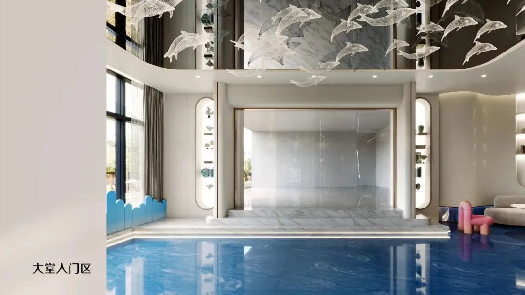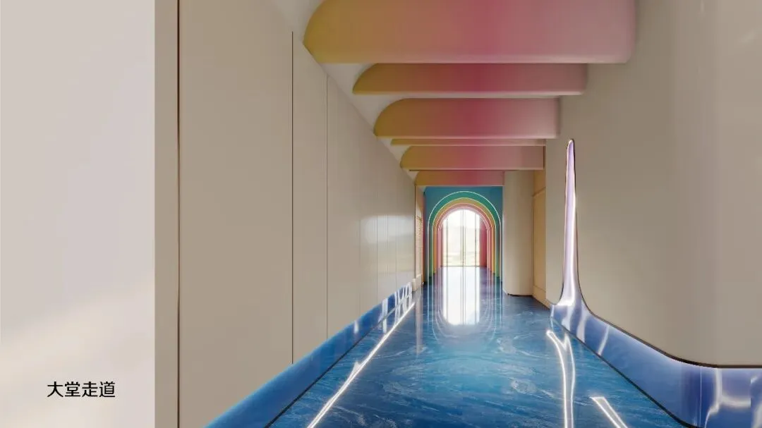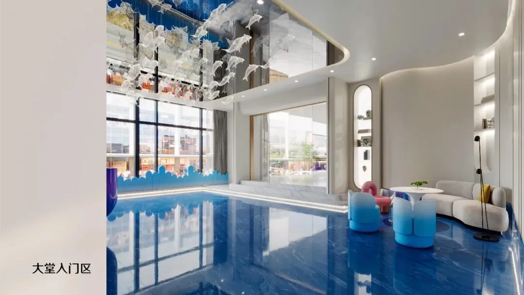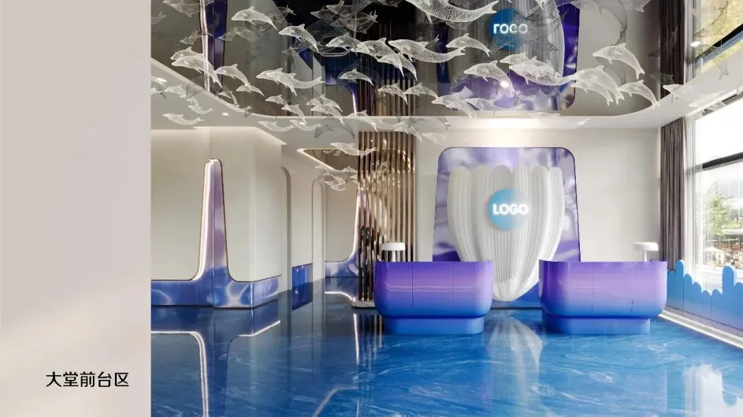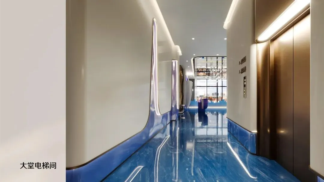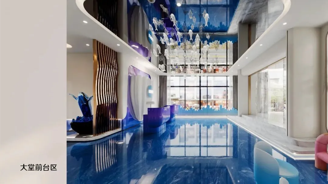 一踏入大堂,便如坠入深海。设计师以海洋色彩为基调——从浅蓝到深蓝的渐变墙面,搭配波浪形地面动线。